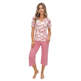 Piżama damska Tina 3/4 kr/r to elegancka i wygodna propozycja dla kobiet, które cenią sobie komfort snu połączony z kobiecym designem. Model wykonany został z wysokiej jakości wiskozy z dodatkiem elastanu, co zapewnia wyjątkową miękkość, przewiewność oraz idealne dopasowanie do sylwetki. Koszulka z krótkim rękawem ozdobiona subtelnym, kwiatowym printem prezentuje się niezwykle stylowo, a dekolt w kształcie litery V, wykończony delikatną ażurową koronką, dodaje całości elegancji i romantycznego charakteru. Do kompletu dołączone są jednolite spodnie o długości 3/4, które gwarantują swobodę ruchów i komfort noszenia zarówno podczas snu, jak i domowego relaksu. Piżama Tina 3/4 kr/r doskoEAN čárové kódy zboží jsou: