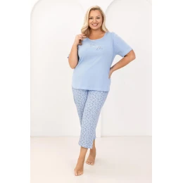 Koszulka z krótkim rękawem i klasycznym, półokrągłym dekoltem gwarantuje wygodę użytkowania. Przód ozdobiony subtelnym nadrukiem dodaje piżamie kobiecego i nowoczesnego charakteru. Do kompletu dołączone są wzorzyste spodnie o długości 7/8, które idealnie sprawdzają się zarówno podczas snu, jak i domowego relaksu. Elastyczna gumka w pasie, obszyta bawełną, zapewnia doskonałe dopasowanie bez uczucia ucisku.