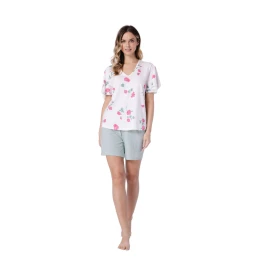 Piżama damska Vivian 1725 marki Leveza to kobieca i komfortowa propozycja na sezon wiosenno-letni. Wykonana w 100% z naturalnej bawełny, zapewnia doskonałą przewiewność, miękkość oraz komfort noszenia nawet podczas ciepłych nocy. Bluzka z dekoltem w serek oraz krótkim, motylkowym rękawem subtelnie podkreśla sylwetkę i nadaje całości lekkości. Kwiatowy wzór z motywem róż oraz delikatna, śmietankowa kolorystyka dodają piżamie elegancji i romantycznego charakteru. Szorty o długości do połowy uda, w groszkowym odcieniu z kwiatowym printem, zapewniają swobodę ruchów i wygodę. Idealna piżama dla kobiet ceniących styl, naturalne materiały i wygodę.
