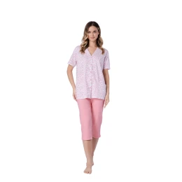 Piżama damska rozpinana Odetta 1722 marki Leveza to wygodna i funkcjonalna propozycja na sezon wiosna–lato. Wykonana w 100% z naturalnej bawełny, jest miękka, przewiewna i delikatna dla skóry, zapewniając komfort snu oraz domowego wypoczynku. Bluzka zapinana na guziki z dekoltem w serek oraz krótkim rękawem została wyposażona w praktyczną kieszeń, a drobny kwiatowy wzór w biało-koralowej kolorystyce nadaje całości lekkości i świeżości. Spodnie o długości 3/4 typu rybaczki w jednolitym, koralowym kolorze gwarantują swobodę ruchów i wygodę noszenia. To idealna piżama dla kobiet ceniących komfort, klasyczny fason i praktyczne detale.