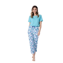 Piżama damska Jana 1741 marki Leveza to połączenie świeżej kolorystyki, naturalnych materiałów i wygodnego kroju. Wykonana w 100% z uszlachetnionej bawełny, jest wyjątkowo miękka, gładka i przyjemna dla skóry, a jednocześnie zapewnia doskonałą przewiewność. Bluzka z krótkim rękawem i klasycznym, okrągłym dekoltem w jednolitym turkusowym kolorze prezentuje się lekko i nowocześnie. Spodnie o długości 7/8 w odcieniach mięty i turkusu zostały ozdobione roślinnym wzorem z motywem listków oraz dekoracyjną kokardą w pasie. To idealna piżama na sezon wiosna–lato, stworzona z myślą o komforcie i kobiecym stylu.