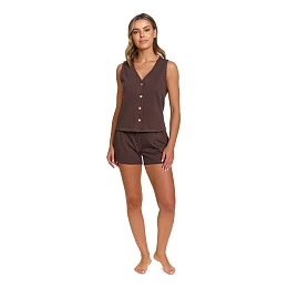 Stylové a pohodlné dámské pyžamo s šortkami je ideální volbou pro teplé noci a chvíle domácího odpočinku. Souprava se skládá z lehkého topu bez rukávů se zapínáním na knoflíky a pohodlných šortek, které zajišťují naprostou volnost pohybu. Díky klasickému střihu a minimalistickému designu vypadá souprava elegantně a nadčasově.