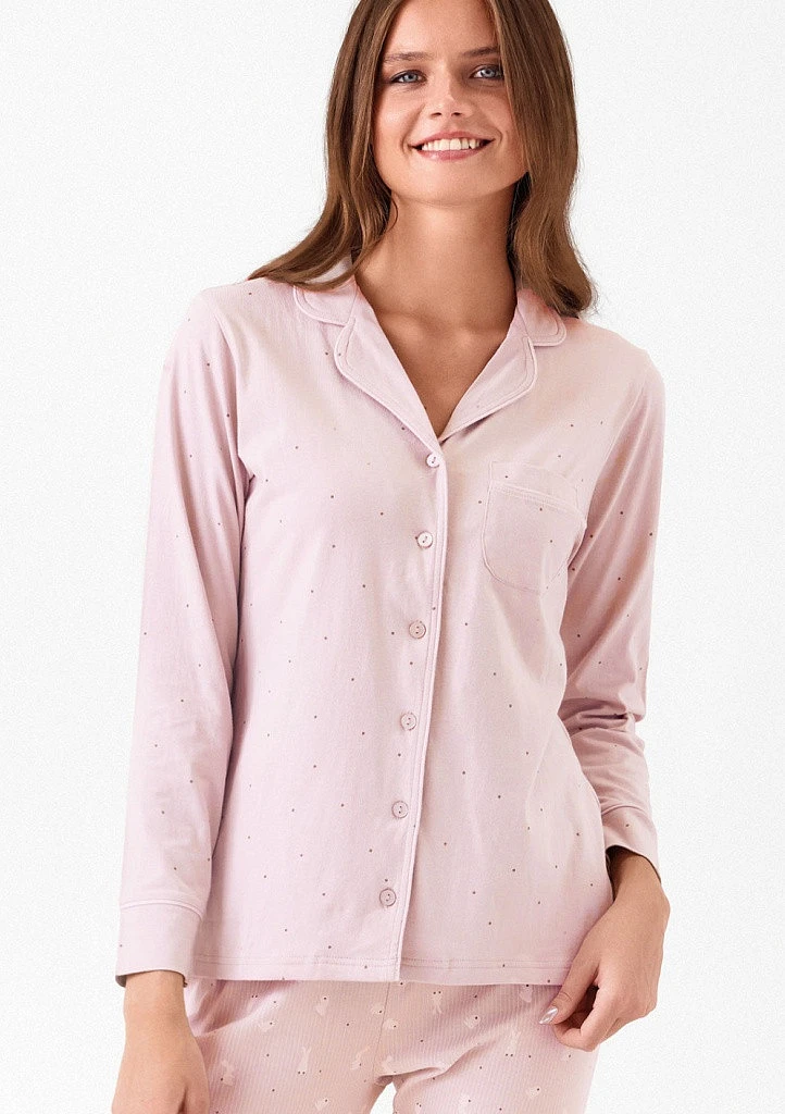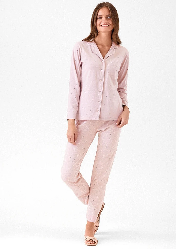 Dopřejte si chvíle klidu a pohodlí v dámském pyžamu Infiore, které spojuje měkký materiál, pohodlný střih a jemný design se zajíčky. Ideální volba pro ženy, které chtějí i doma vypadat upraveně a cítit se příjemně. Dvoudílné pyžamo s celopropínacím kabátkem a kalhotami s gumou v pase. Pyžama této značky jsou známá tím, že kombinují pohodlí s lehkou elegancí a jsou vhodná nejen na spaní, ale i domácí relax.