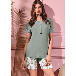 Dámské pyžamo značky Lormar v jemném zeleném odstínu působí svěže a elegantně. Horní díl tvoří tričko s krátkým rukávem, které je doplněno knoflíkovou légou u výstřihu a decentní krajkou na rukávech, dodávající modelu ženský a sofistikovaný vzhled. Spodní díl tvoří pohodlné kraťasy ve světlé barvě s jemným přírodním potiskem, které krásně ladí s vrchním dílem. Materiál je lehký, měkký a příjemný na dotek, ideální pro klidný spánek i pohodlné domácí nošení.