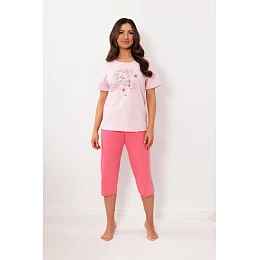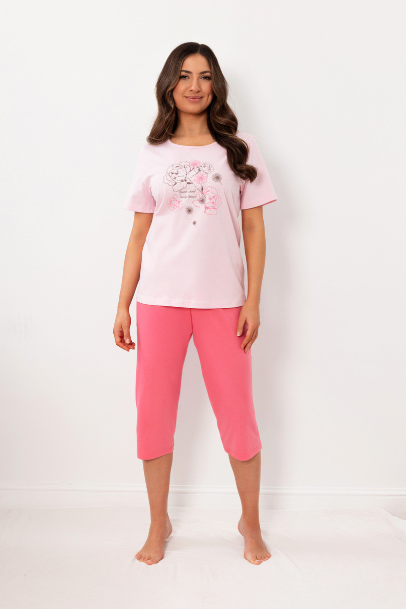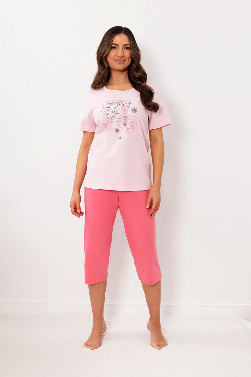 Košili s krátkým rukávem v jemném světlém odstínu zdobí decentní květinový potisk, který působí romanticky a žensky, zatímco 3/4 kalhoty v kontrastní energické barvě dodávají soupravě svěží a moderní vzhled a elastický pas zajišťuje pohodlné nošení bez otlaků.