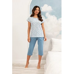 Vrchní část pyžama tvoří tričko s krátkým rukávem zdobené jemným, ženským potiskem drobných květů, díky němuž celek působí lehce a půvabně. 3/4 dlouhé kalhoty v jednotném, teplém odstínu béžové barvy soupravu dokonale doplňují a vytvářejí harmonický a stylový celek.