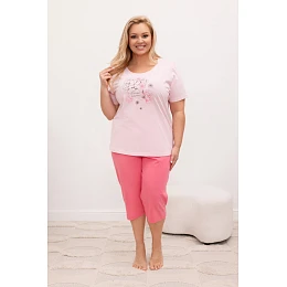 Košili s krátkým rukávem v jemném světlém odstínu zdobí decentní květinový potisk, který působí romanticky a žensky, zatímco 3/4 kalhoty v kontrastní energické barvě dodávají soupravě svěží a moderní vzhled a elastický pas zajišťuje pohodlné nošení bez otlaků.