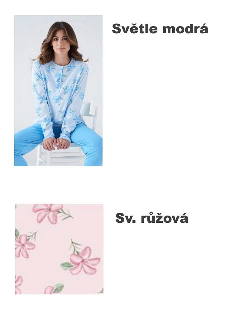 Dámské bavlněné pyžamo značky Karelpiu. Pyžamo se skládá z trička s dlouhým rukávem, okolo krku je kulatý výstřih a léga se třemi knoflíky. Rukávy jsou ukončené do lemu ze stejného materiálu, jako je tričko. Kalhoty jsou v pase do pružné obšité gumy. Pyžamo je ušité z příjemné hřejivé bavlny.