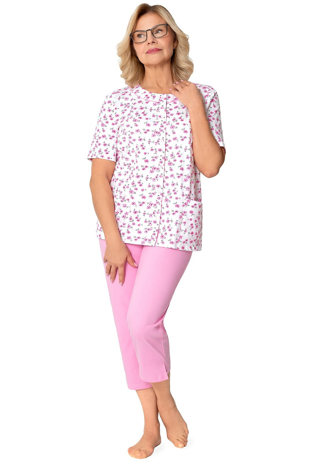 Blůza pyžama má krátké rukávy a je ozdobená květinovým vzorem. Půlkulatý výstřih se zapíná knoflíčky. Hladké kalhoty mají 3/4 délku. Střih a vzhled pyžama zachycují první čtyři fotografie.