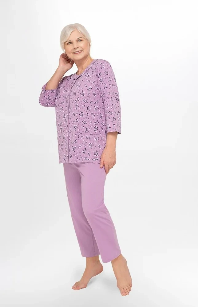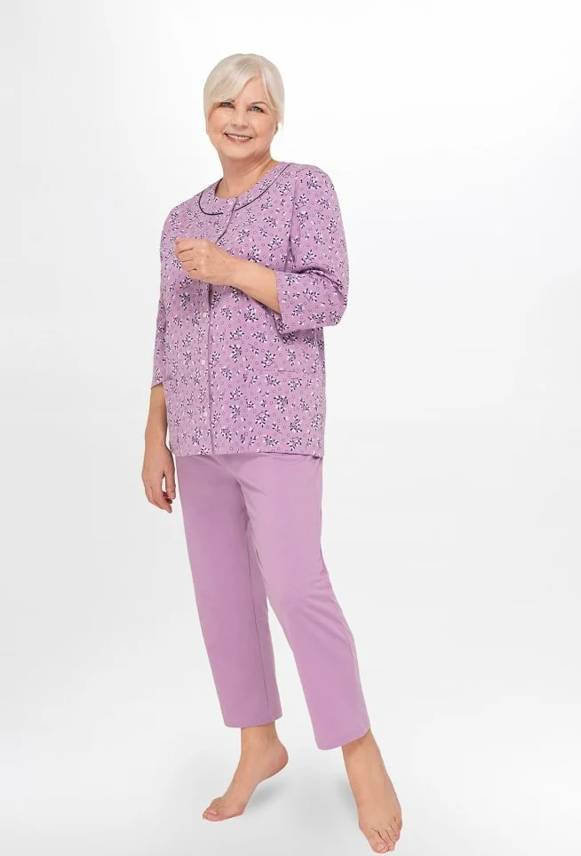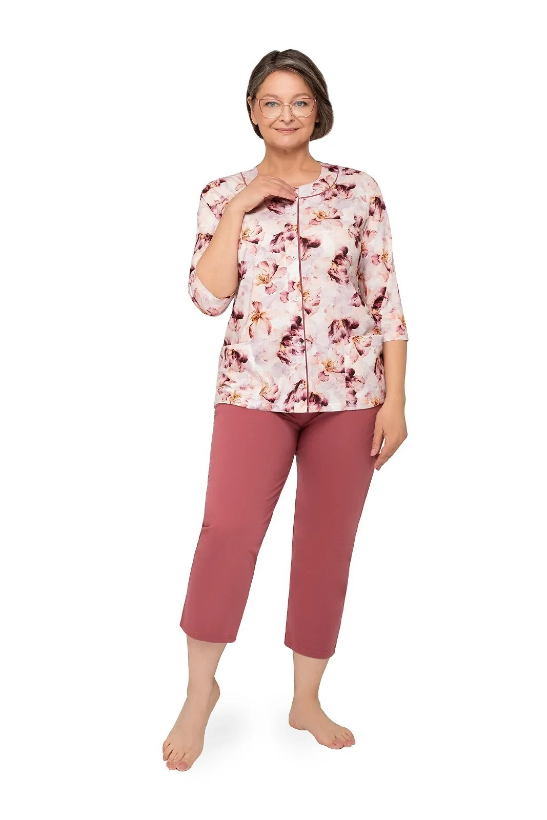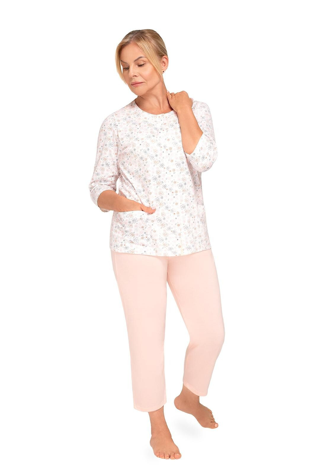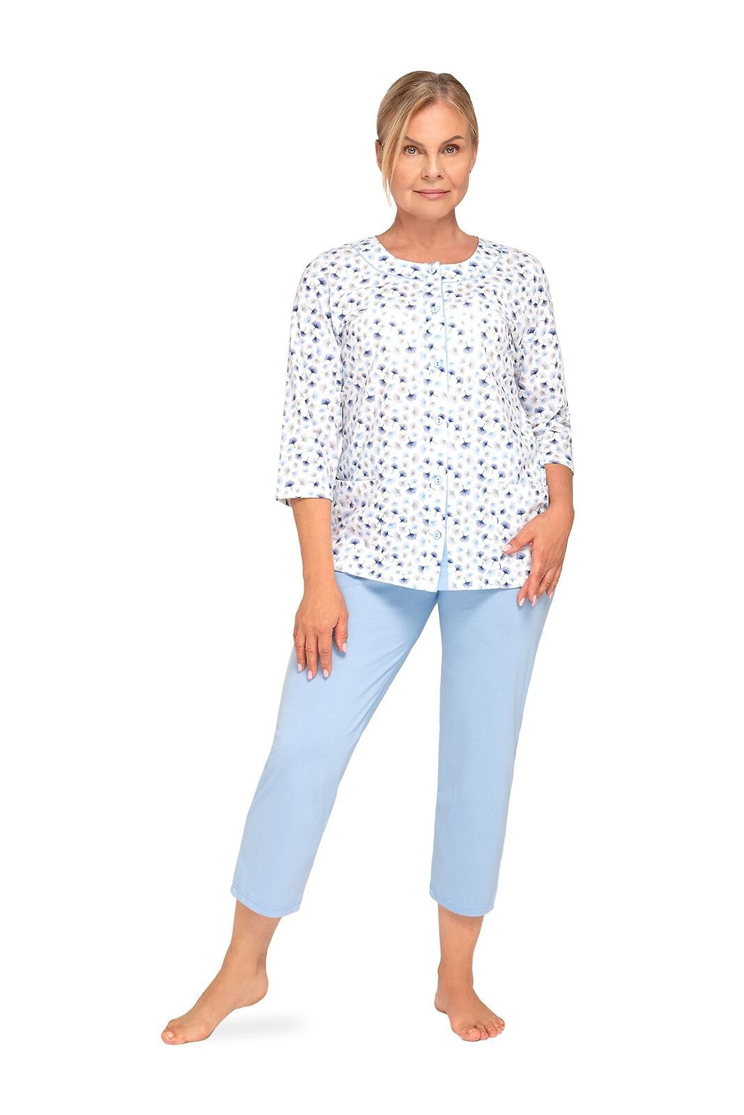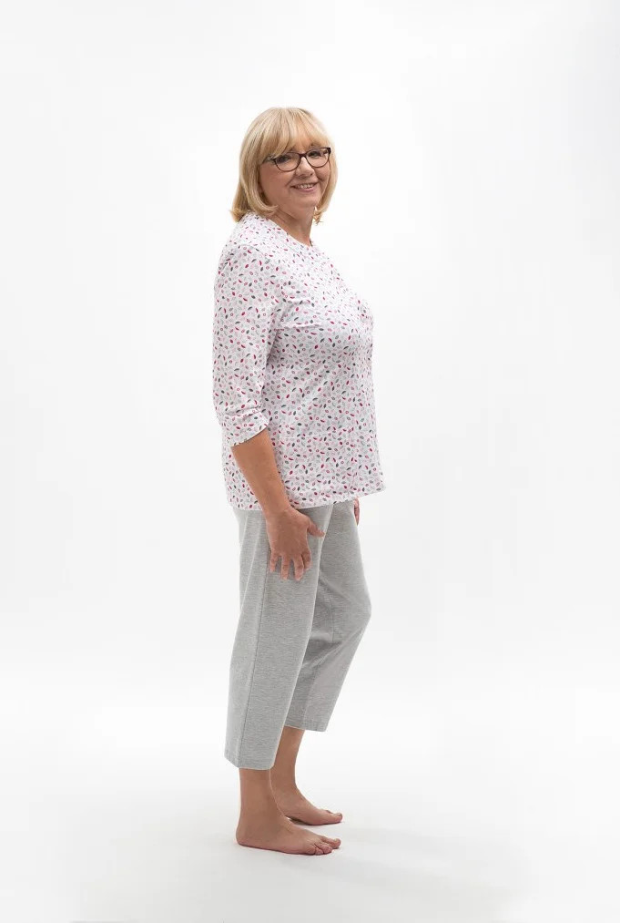 Blůza pyžama má 3/4 rukávy a je ozdobená květinovým vzorem. Půlkulatý výstřih se zapíná knoflíčky. Hladké kalhoty mají 3/4 délku. Střih a vzhled pyžama zachycují první tři fotografie.