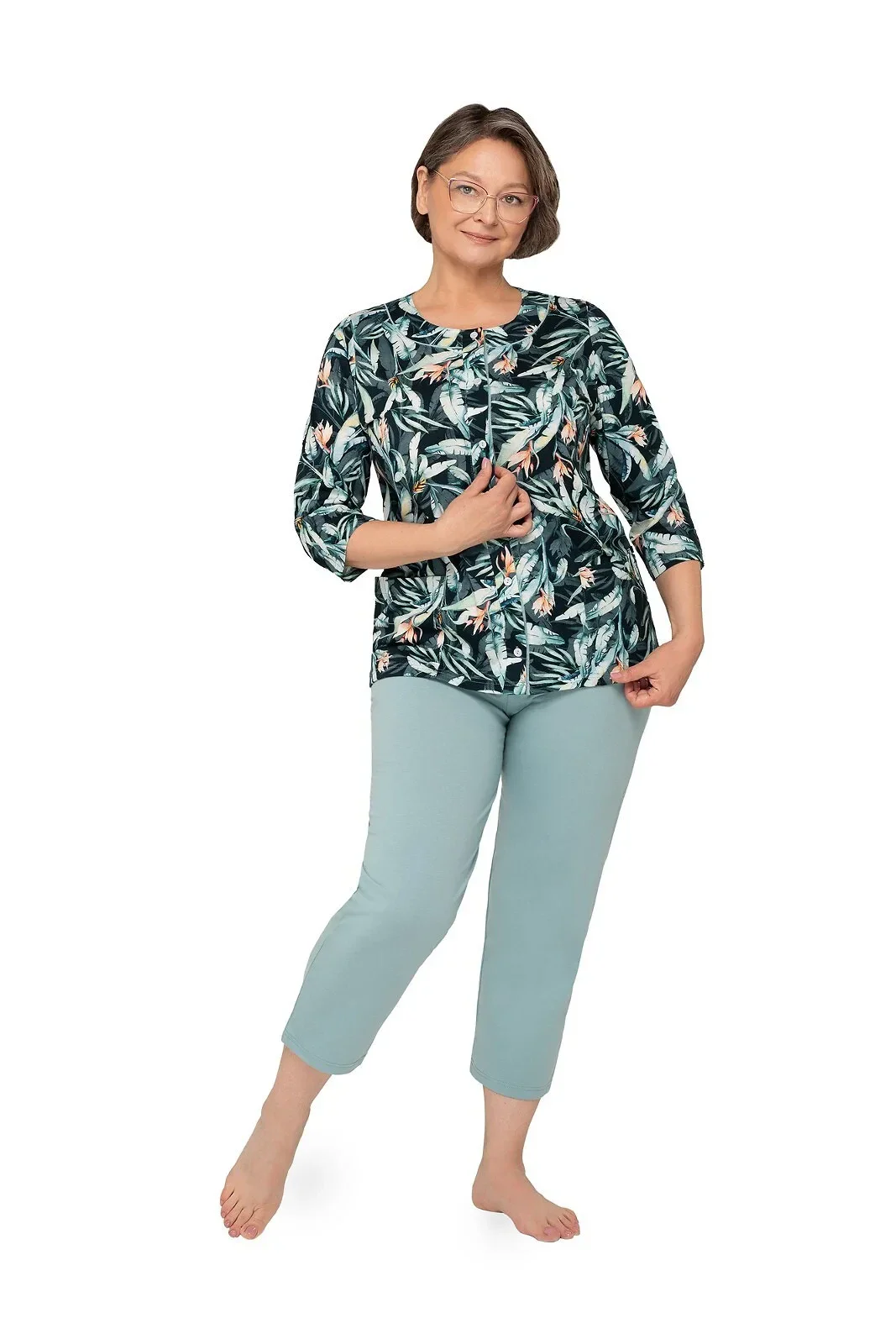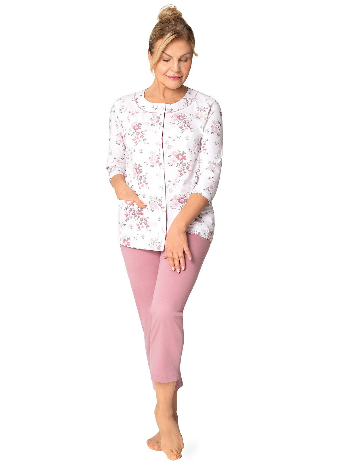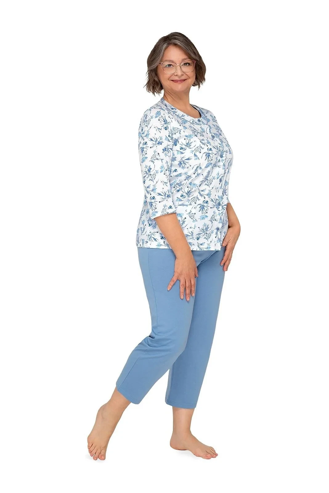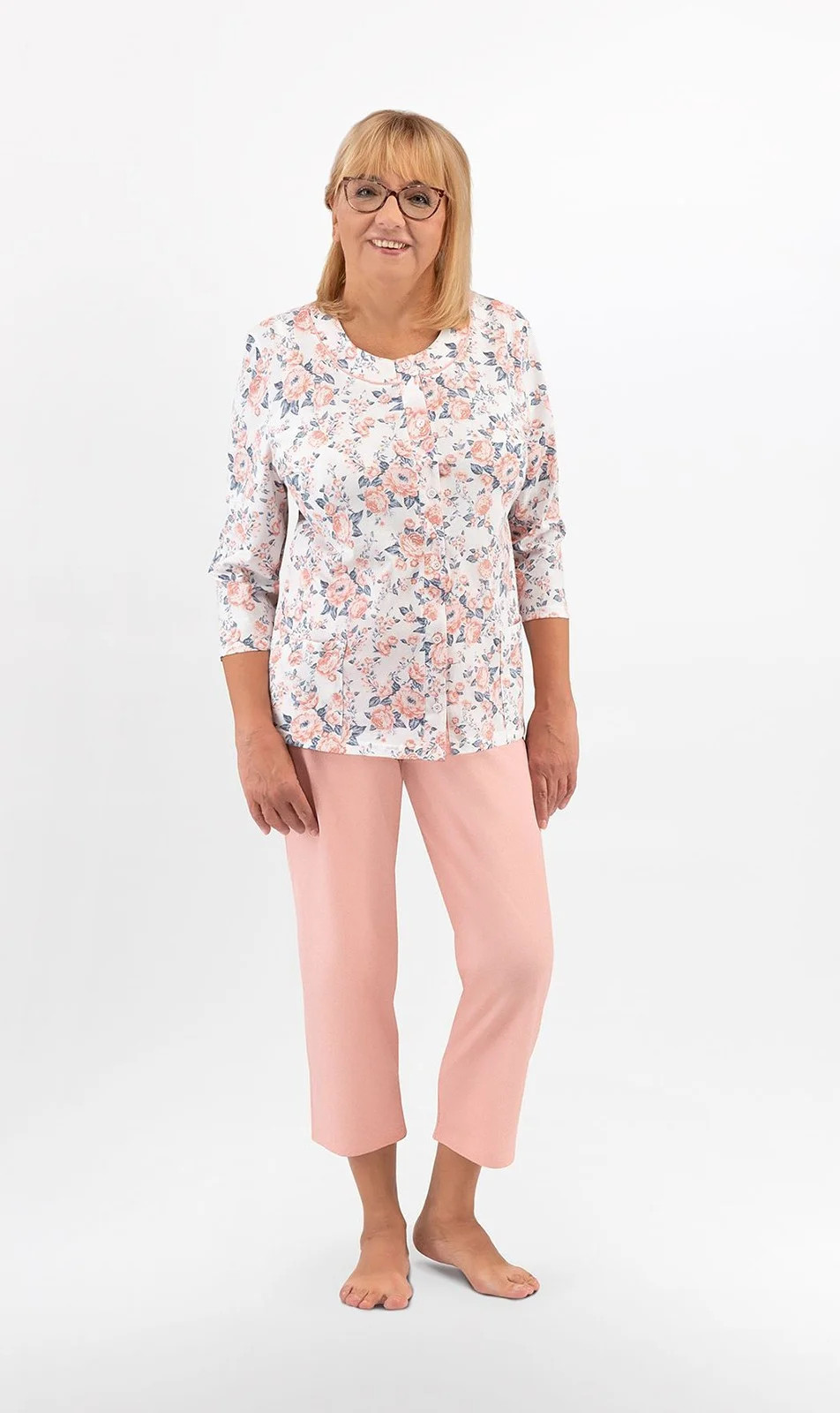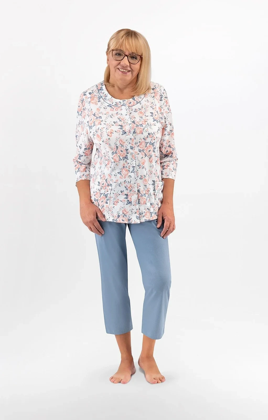 Blůza pyžama má 3/4 rukávy a je ozdobená květinovým vzorem. Půlkulatý výstřih se zapíná knoflíčky. Hladké kalhoty mají 3/4 délku. Střih a vzhled pyžama zachycují první tři fotografie.