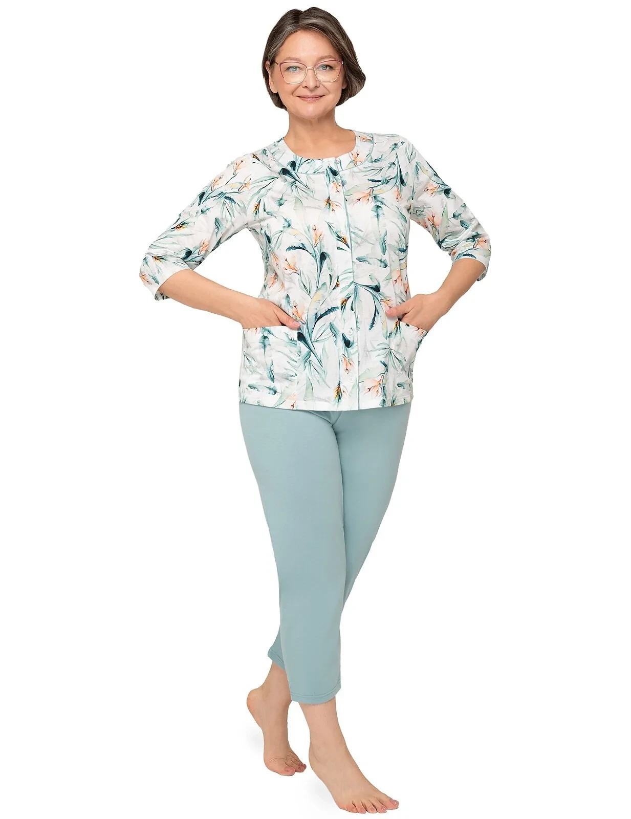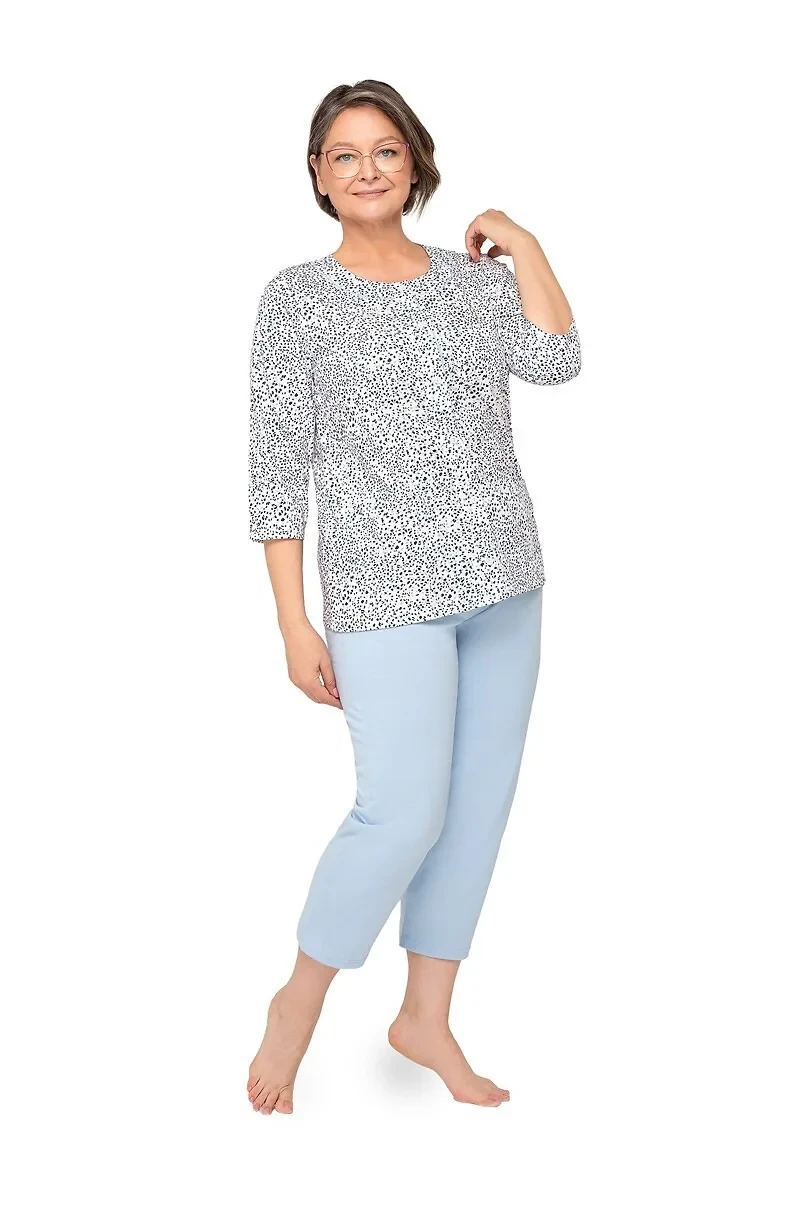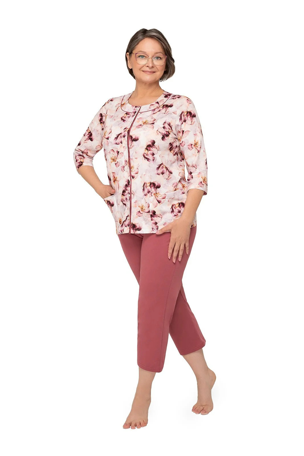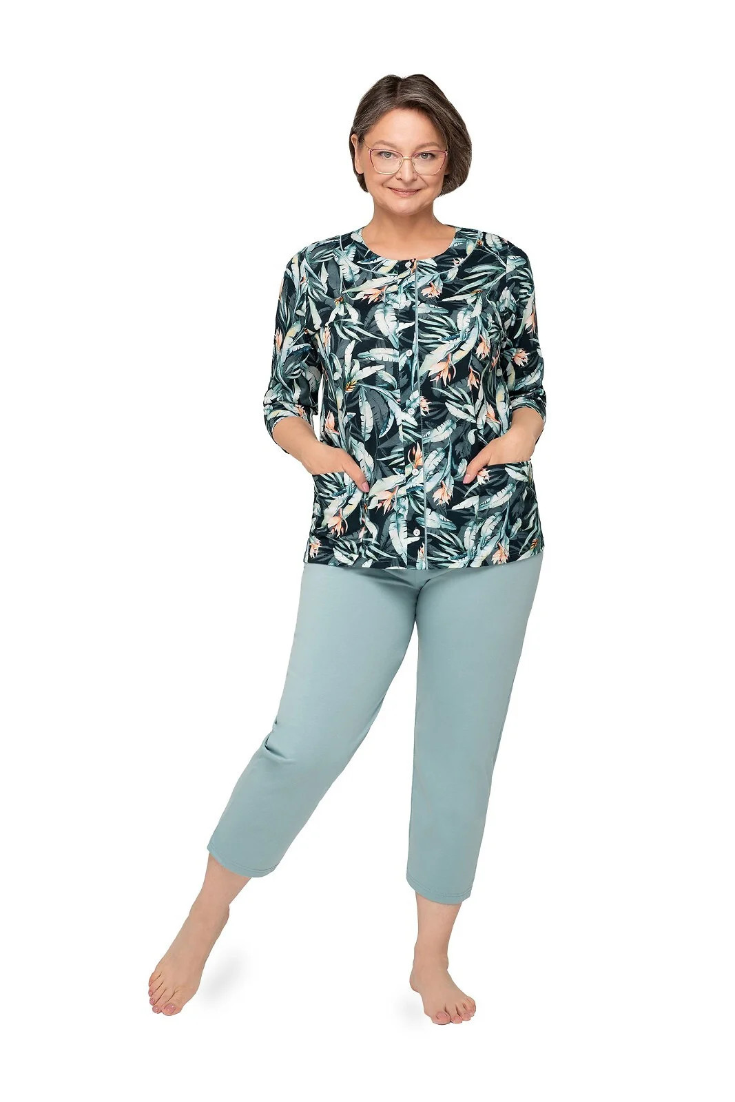 Blůza pyžama má 3/4 rukávy a je ozdobená květinovým vzorem. Půlkulatý výstřih se zapíná knoflíčky. Hladké kalhoty mají 3/4 délku. Střih a vzhled pyžama zachycují první tři fotografie.