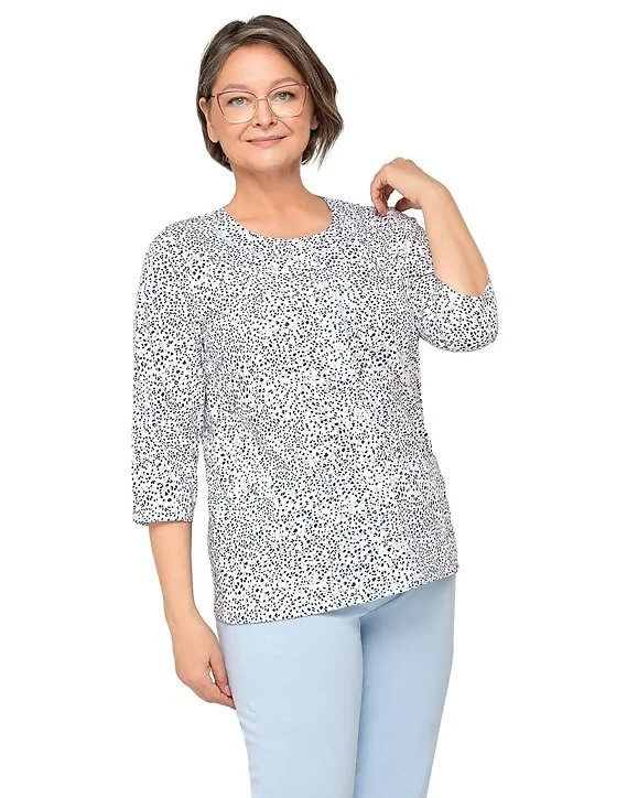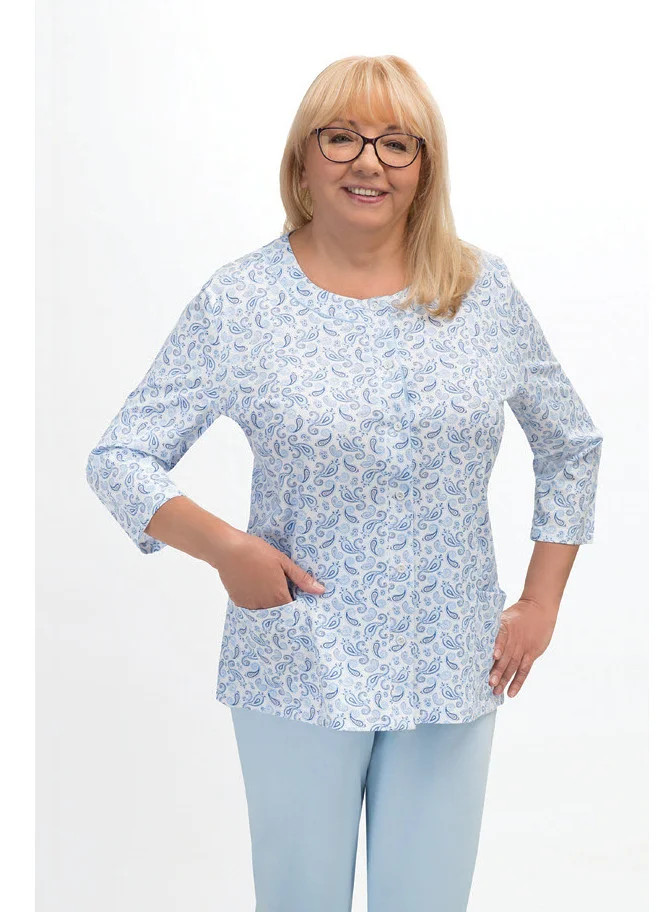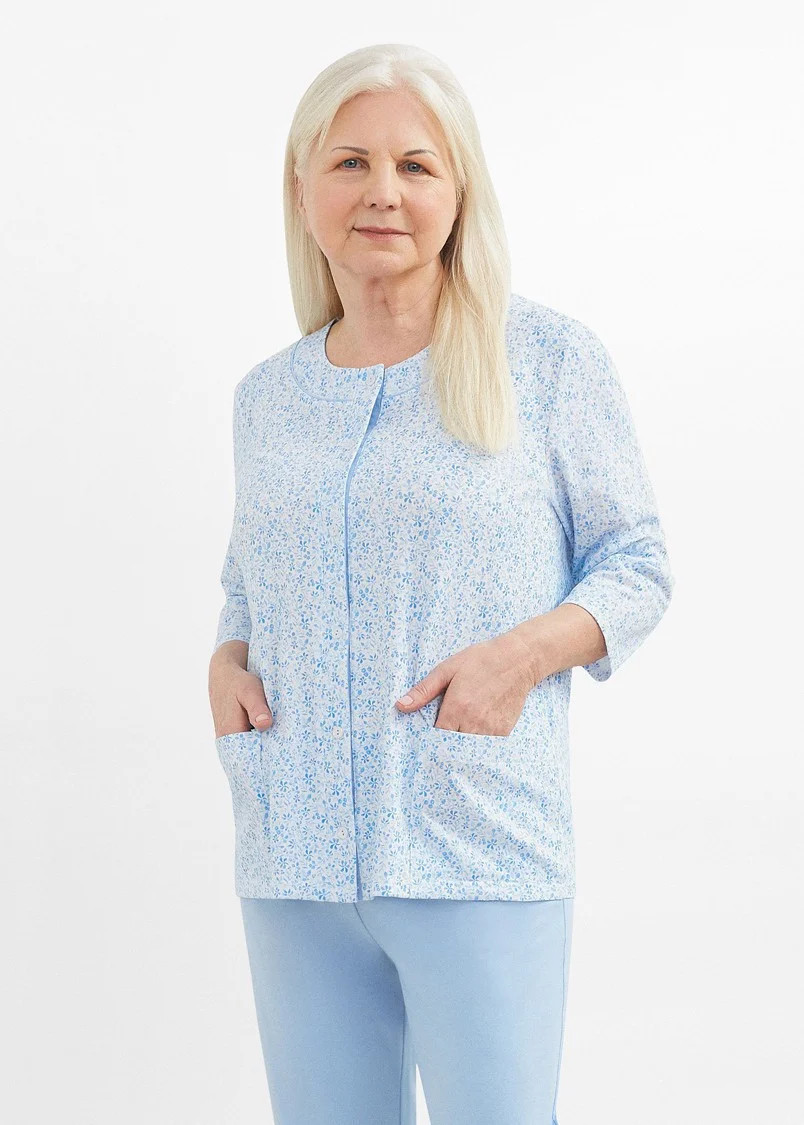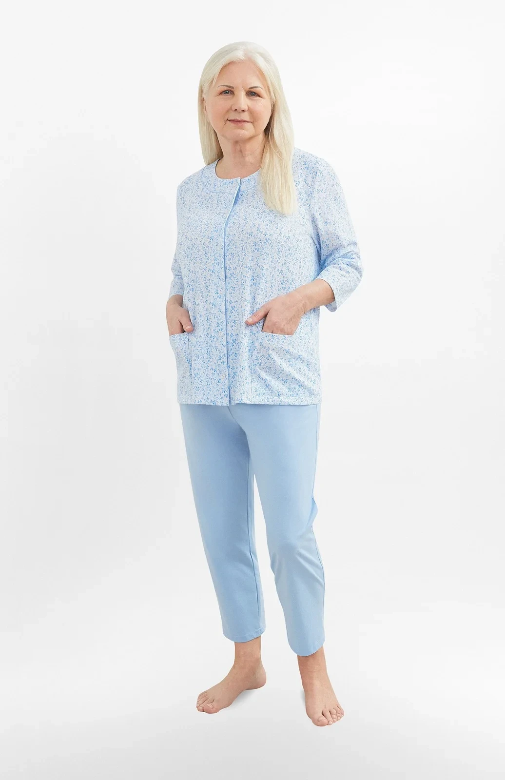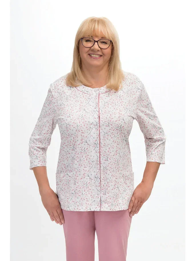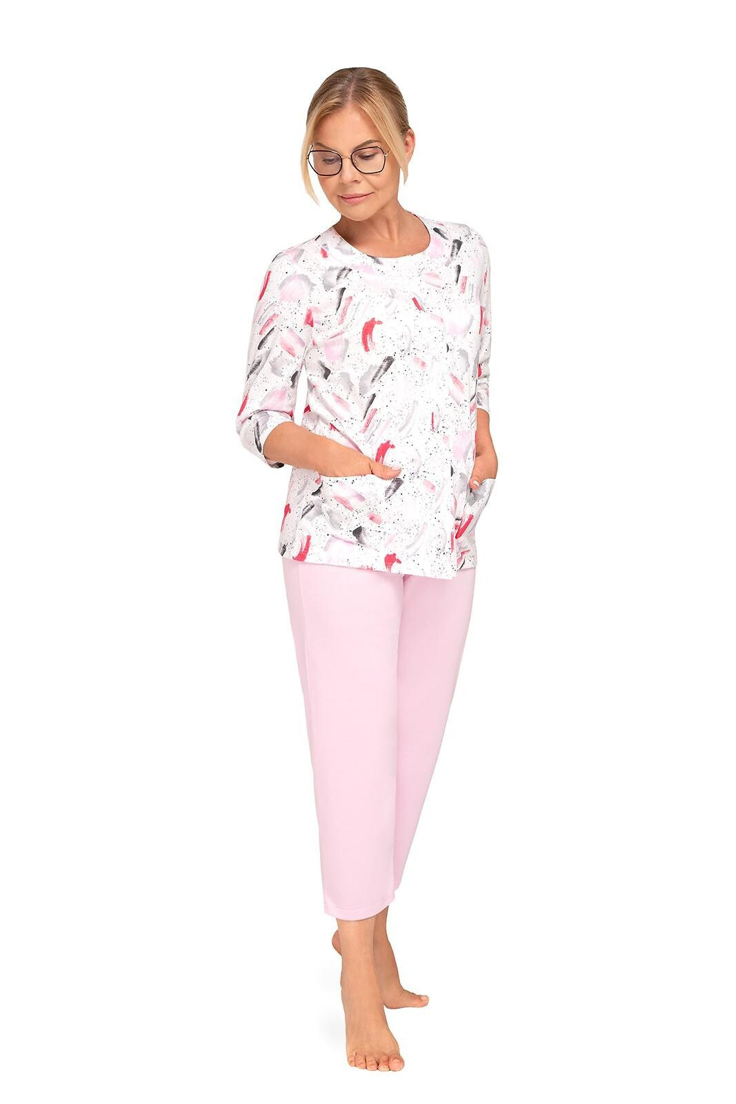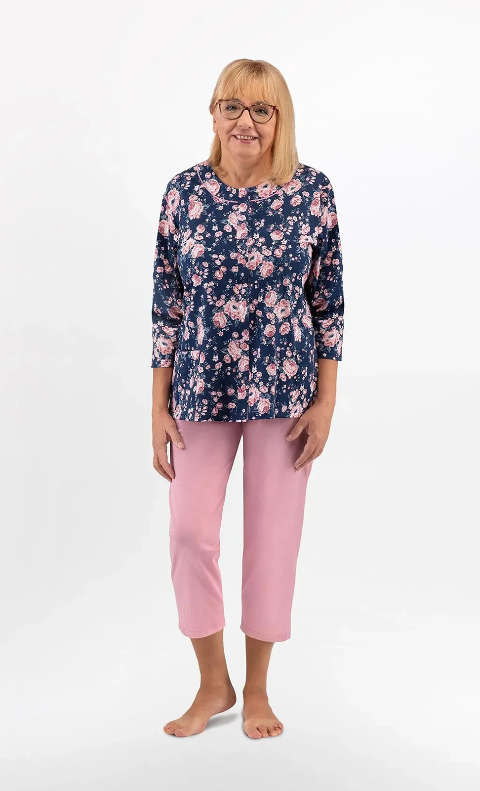 Blůza pyžama má 3/4 rukávy a je ozdobená květinovým vzorem. Půlkulatý výstřih se zapíná knoflíčky. Hladké kalhoty mají 3/4 délku. Střih a vzhled pyžama zachycují první tři fotografie.