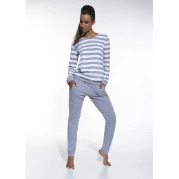 Blůza pyžama se širokými bílo-šedými pruhy má dlouhé rukávy. Pohodlné dlouhé kalhoty s kapsami mají v pase stahovací šňůrku. Manžety, spodní okraj blůzy a nohavice jsou olemované stahovacími lemy.