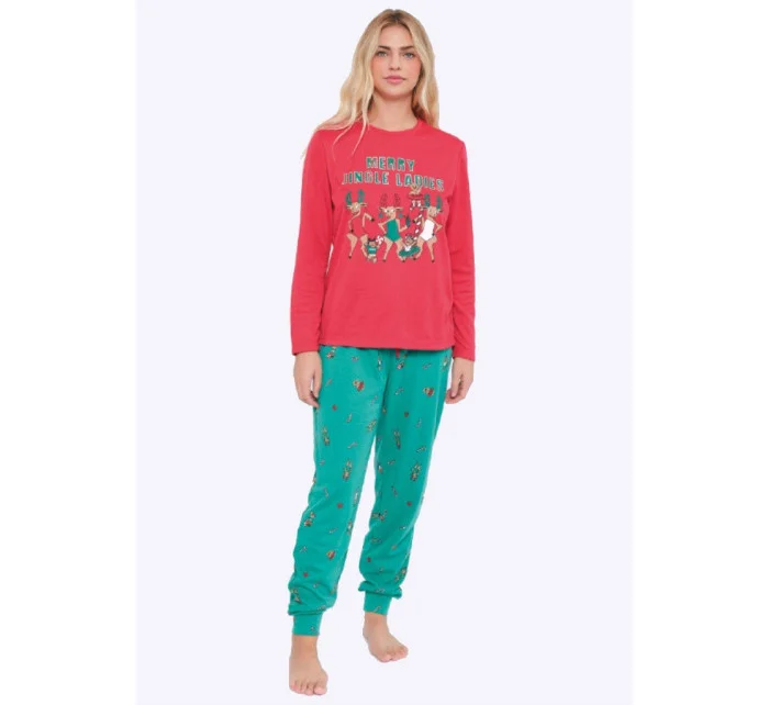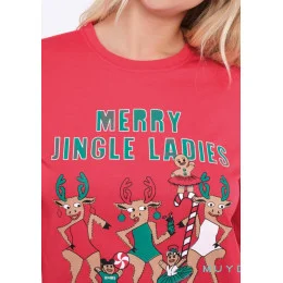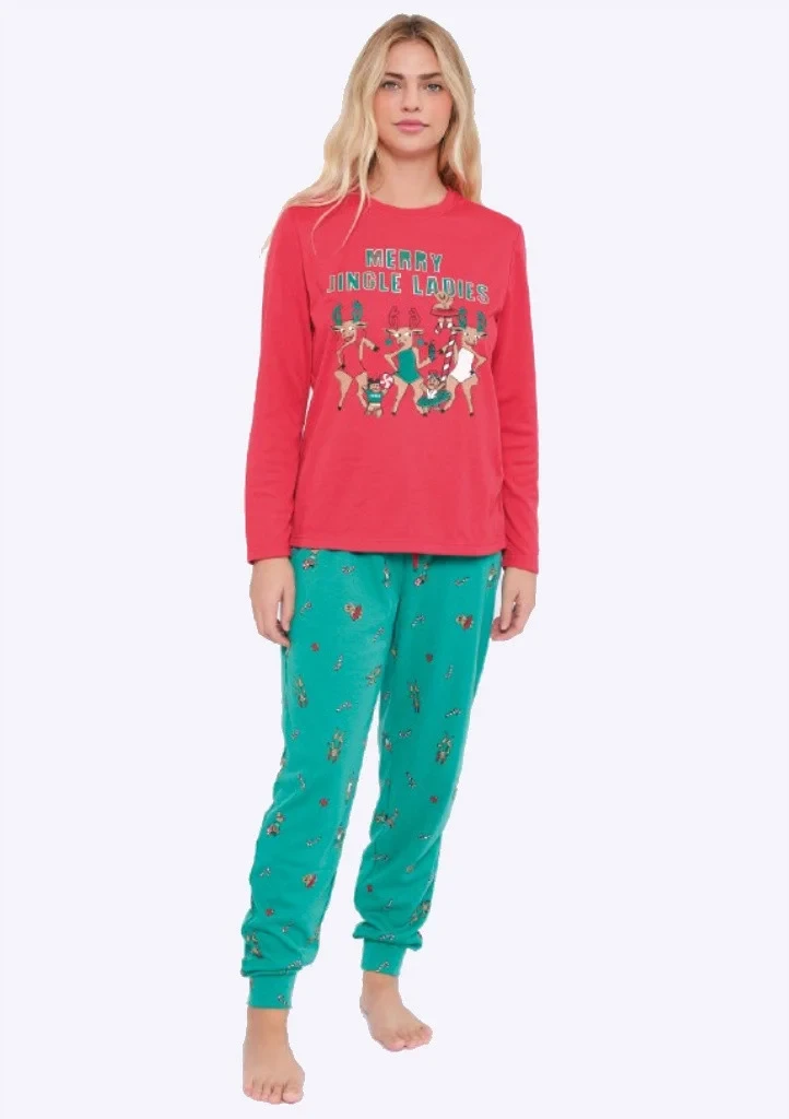Dámské pyžamo španělské značky Muydemi. Pyžamo je laděné s inspirativní vánoční tématikou. Pyžamo má tričko na kterém je v přední části natištěná aplikace. Rukávy jsou ukončené do úpletu. Kalhoty jsou po celé ploše potištěné vánošními sobíky, v pase jsou do pružné gumy v které je provlečená šňůrka pro utáhnutí. Na bocích jsou zapuštěné kapsy. Nohavice jsou ukončené do lemu. Celé pyžamo je podšité jemným hřejivým chloupkem. Vrchní část je bavlněná.