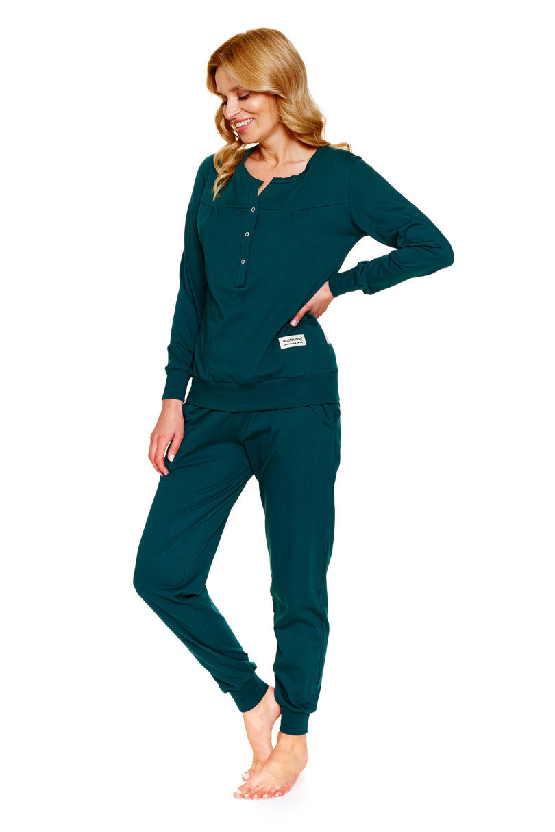 Dámské pyžamo z vysoce kvalitní bavlny. Tričko s dlouhými rukávy, kulatý výstřih se zapínáním na patentky, jemné řasení ve výstřihu, dlouhé jednotné kalhoty se šňůrkou v pase.