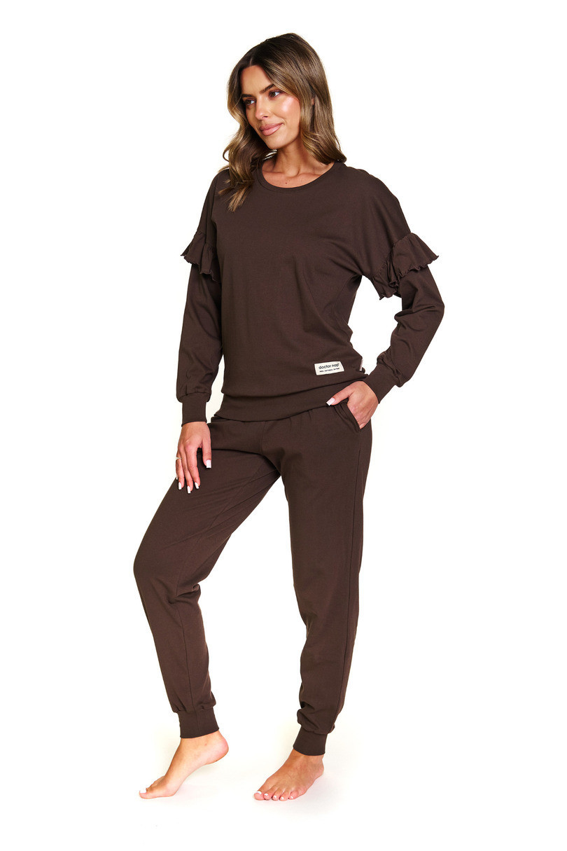 Piżama damska PM.4351 J/25 marki Dr Nap to wyjątkowo kobiecy komplet typu homewear, łączący w sobie wygodę bielizny nocnej z funkcjonalnością odzieży codziennej. Wykonana w 100% z miękkiej, oddychającej bawełny, idealnie sprawdzi się zarówno podczas snu, jak i w ciągu dnia. Górna część piżamy została ozdobiona falbankami na rękawach, które nadają całości lekkości i subtelnego uroku. Fason podkreśla kobiecą sylwetkę, a kieszonki w spodniach dodają praktycznego charakteru.