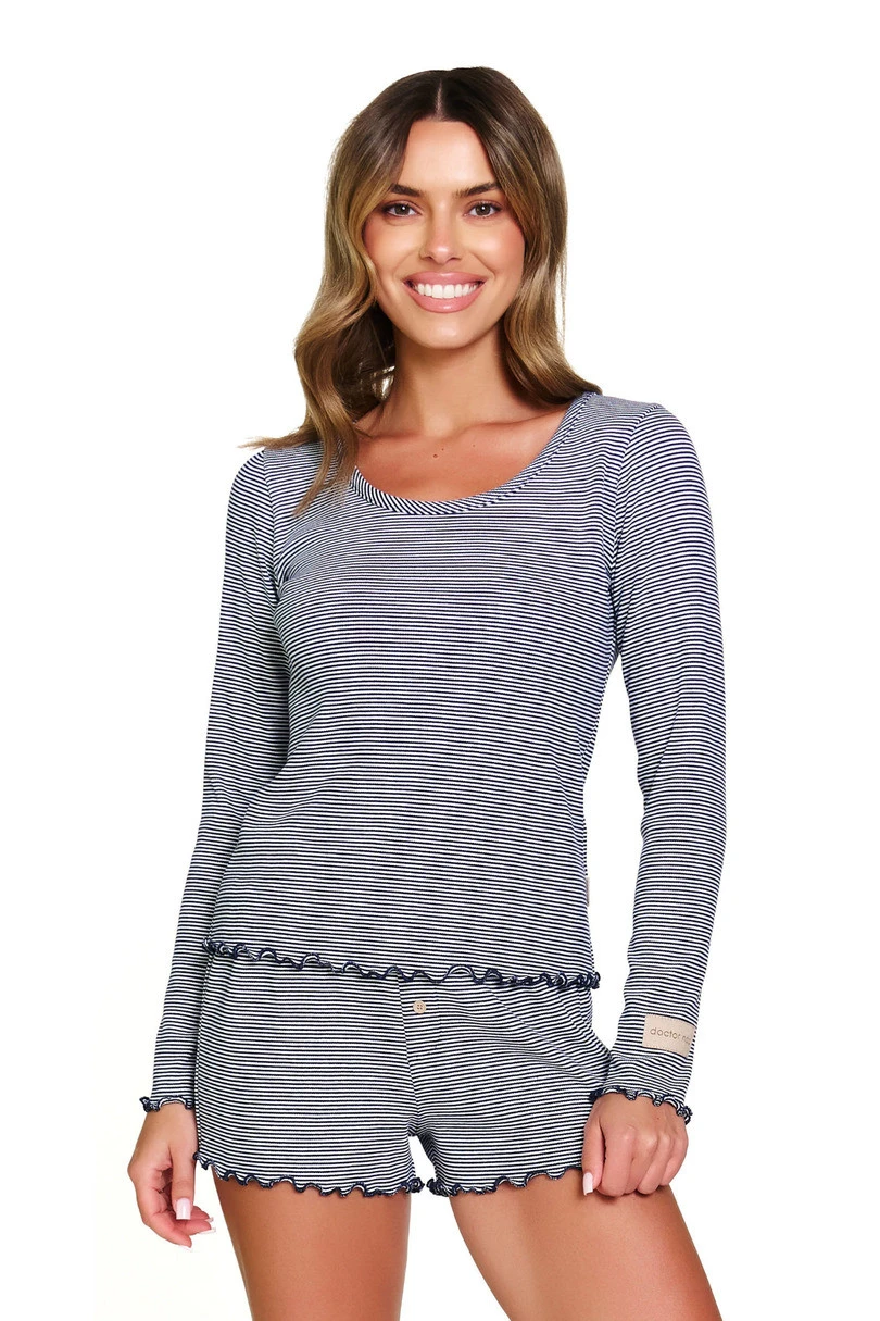 Piżama damska PM.7176 J/25 marki Doctor Nap to lekki i stylowy komplet, który doskonale sprawdzi się w cieplejsze noce i domowy relaks. Górna część zestawu to bluzka z długim rękawem, która zapewnia komfort termiczny, natomiast krótkie spodenki w modny wzór drobnych pasków dodają całości świeżości i letniego charakteru.