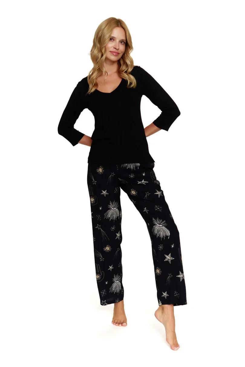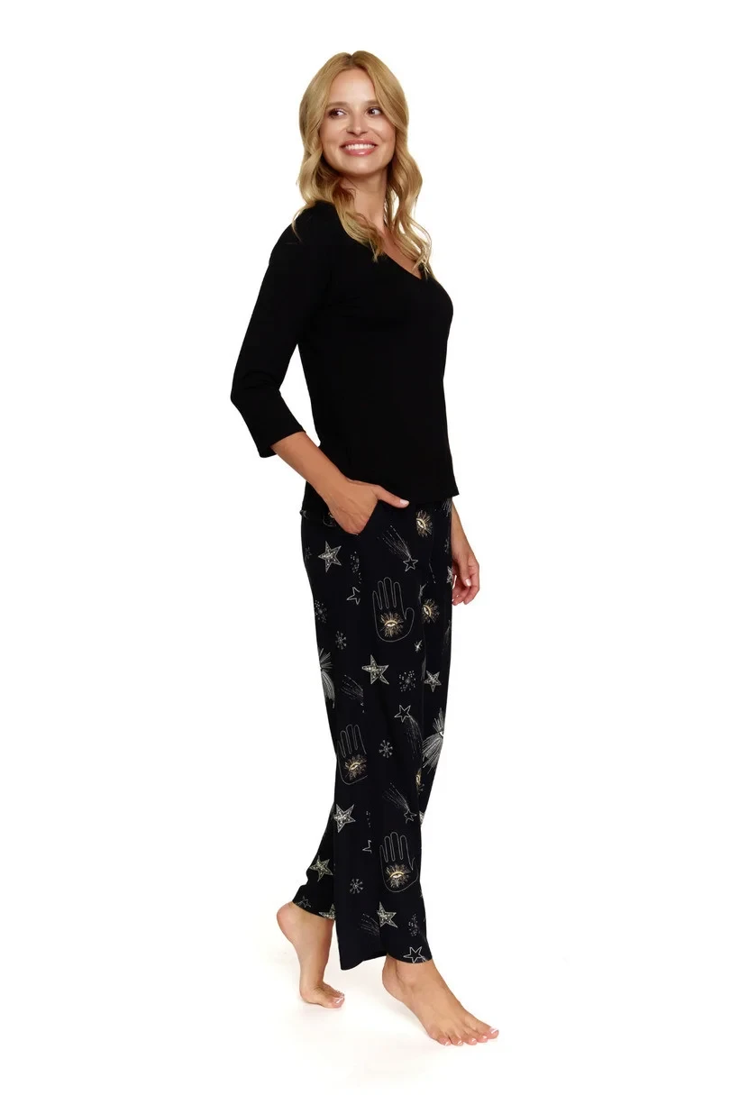Dámské pevné pyžamo s 3/4 rukávy, výstřihem do V a vzorovanými dlouhými kalhotami s kapsami.