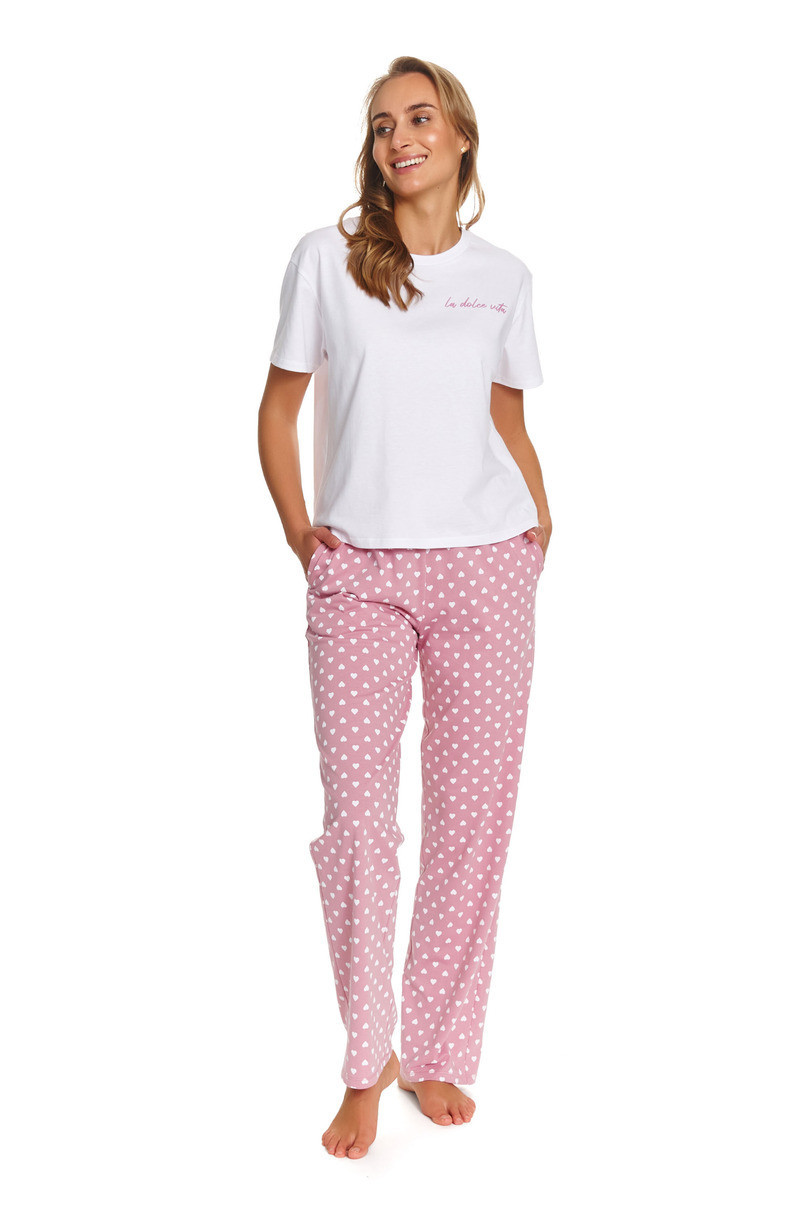 Pyžamo je vyrobeno ze 100% kvalitní přírodní bavlny, která je měkká, prodyšná a příjemná na dotek, což zaručuje pohodlí po celou noc. Bílé tričko s krátkým rukávem a jednoduchým klasickým střihem dokonale přiléhá k tělu a zaručuje volnost pohybu. Jedinečným akcentem je módní potisk "La dolce vita" na zádech, který dodává celé soupravě charakter a odlišuje pyžamo od klasických modelů.