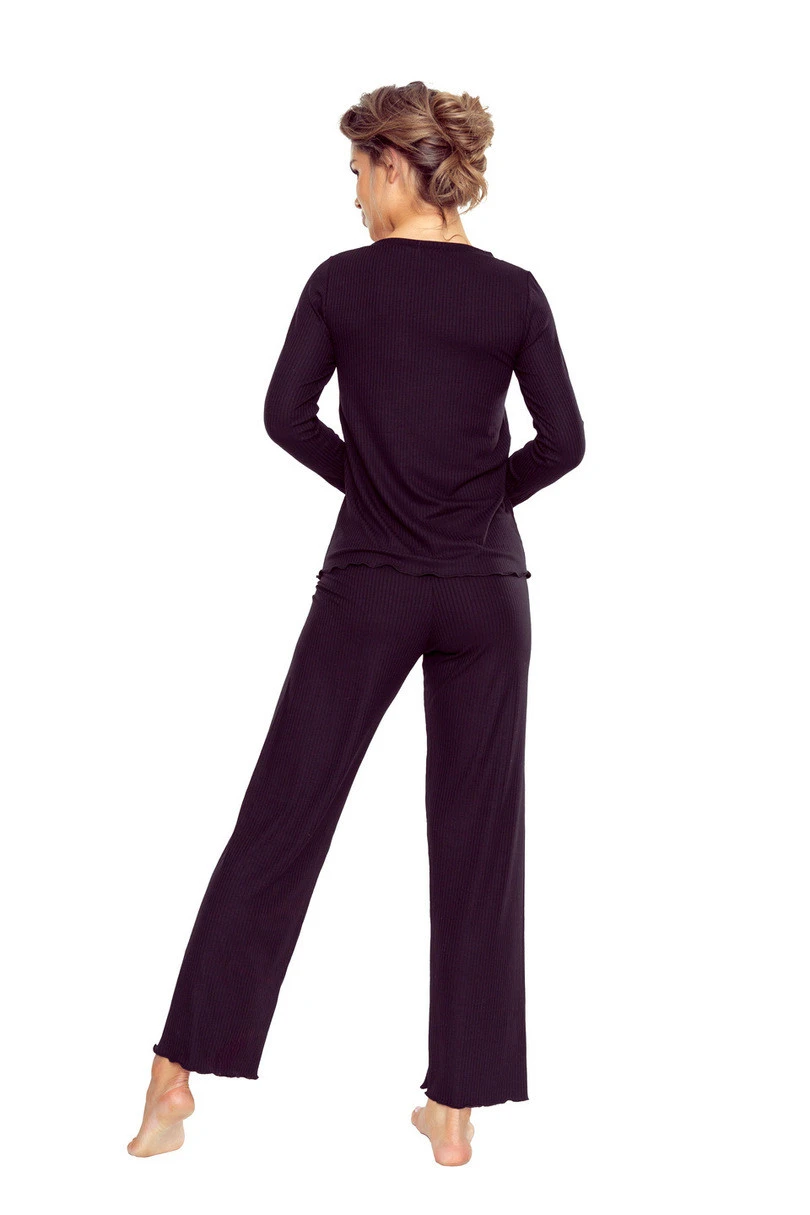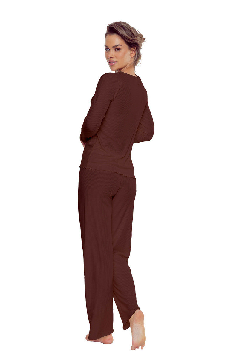 Piżama damska Rosaria to połączenie elegancji i wygody, stworzone z myślą o kobietach, które cenią komfort oraz styl nawet w domowym zaciszu. Wykonana z lekkiej, prążkowanej wiskozy, delikatnie otula ciało i pozwala skórze oddychać. Bluzka z dekoltem w serek subtelnie podkreśla sylwetkę, a ozdobny dół dodaje jej kobiecego uroku. Proste, długie spodnie gwarantują pełen komfort i swobodę ruchów. Idealna jako piżama do snu lub stylowy zestaw po domu.