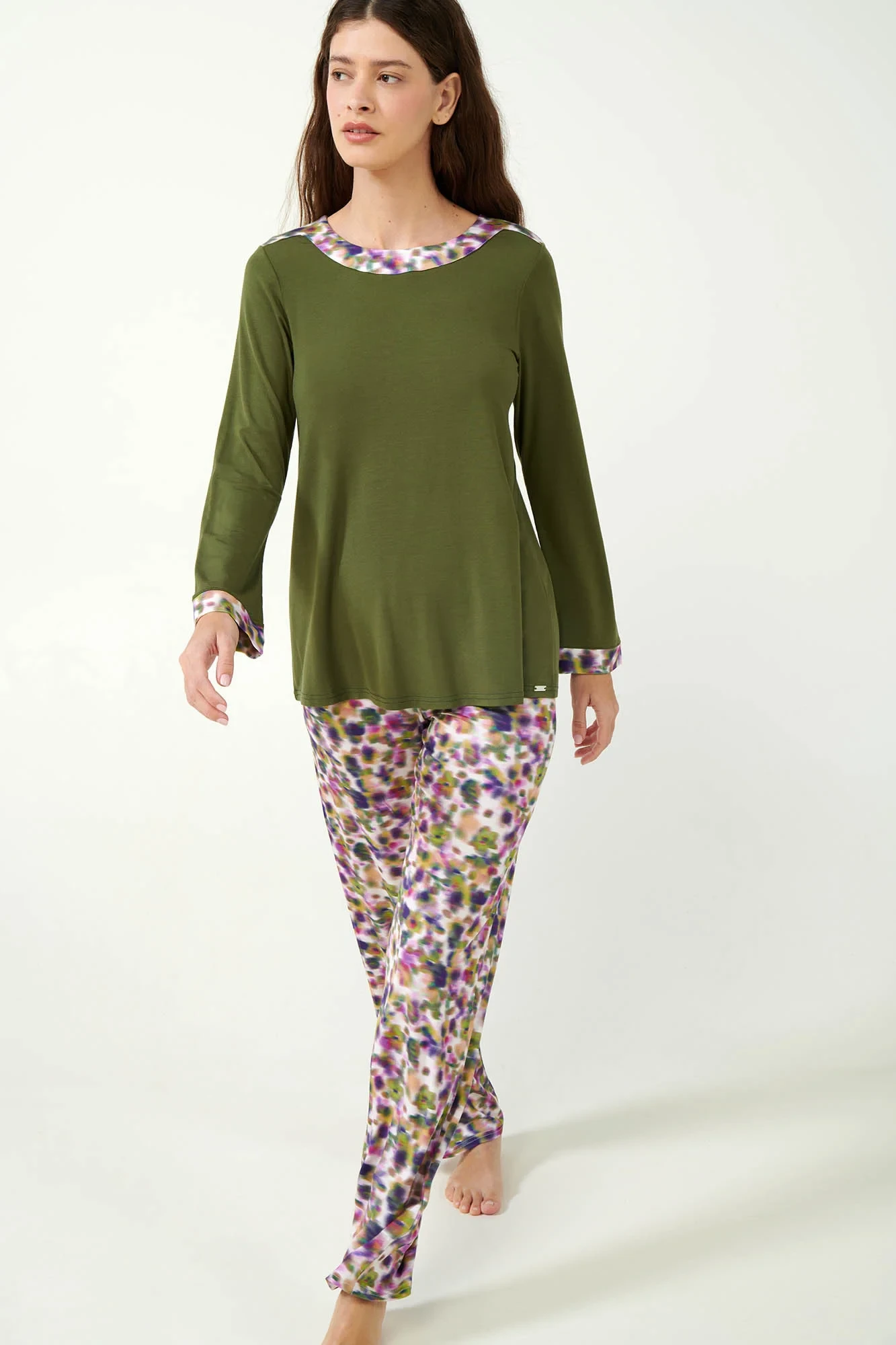 Představujeme vám naše elegantní dámské pyžamo, v němž se klasický design snoubí s moderním stylem. Jednobarevný zelený mechový vršek je krásně zvýrazněn pastelovými květinovými manžetami a sladěným límcem, které dodají vašemu nočnímu prádlu šmrnc. Soupravu doplňují sladěné kalhoty s pastelovými květy, které vytvářejí ucelený a stylový vzhled. Pyžamo je vyrobeno z luxusního mikromodalu a nabízí výjimečnou měkkost a prodyšnost. Díky regular střihu poskytují pohodlí, aniž by dělaly kompromisy ve stylu, a jsou tak dokonalým doplňkem vaší sbírky spacího oblečení.