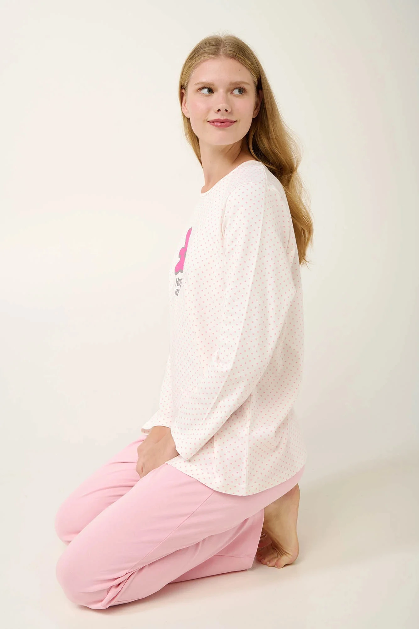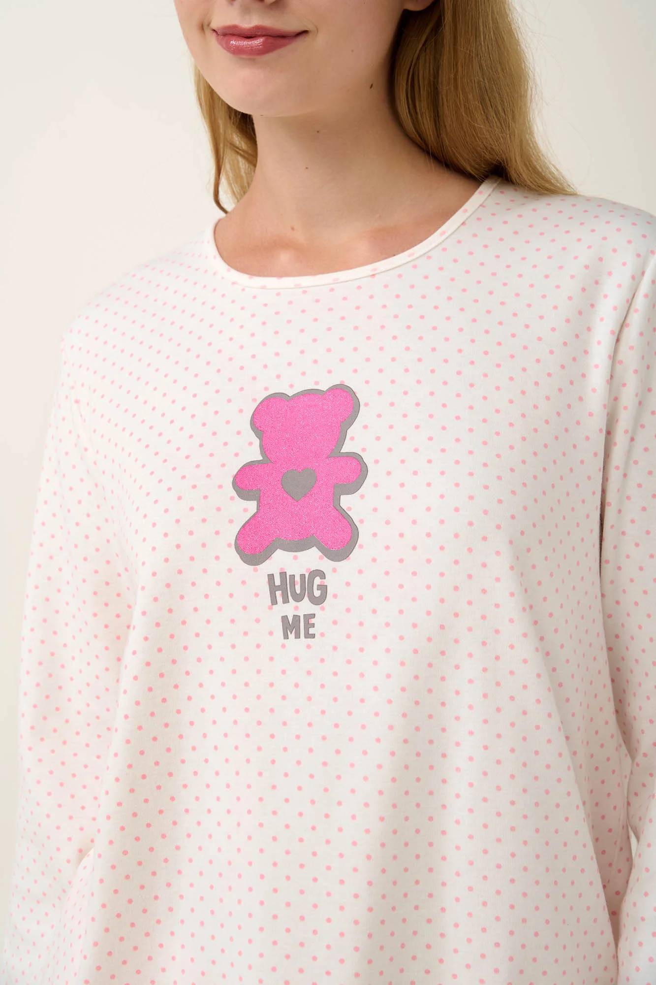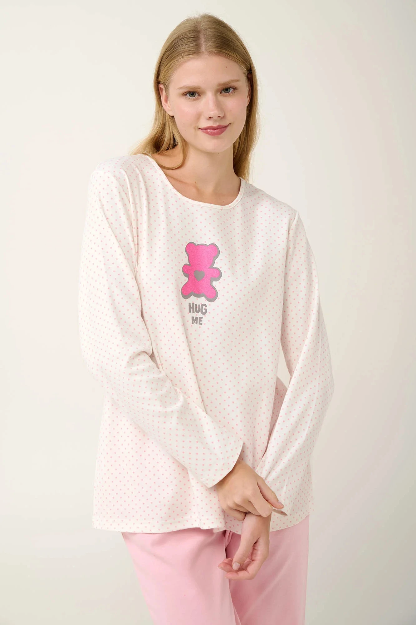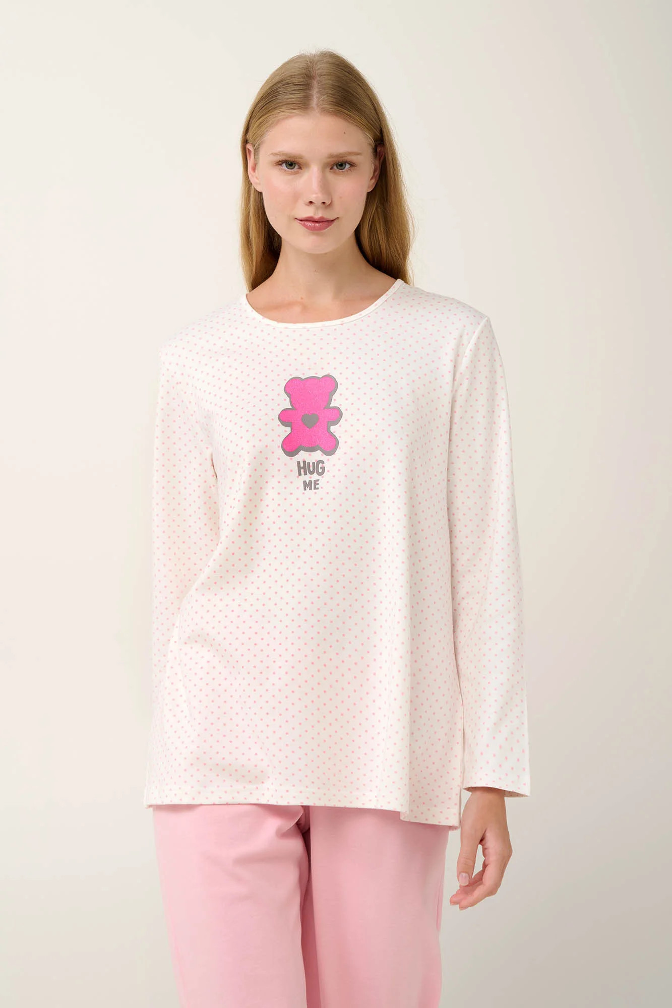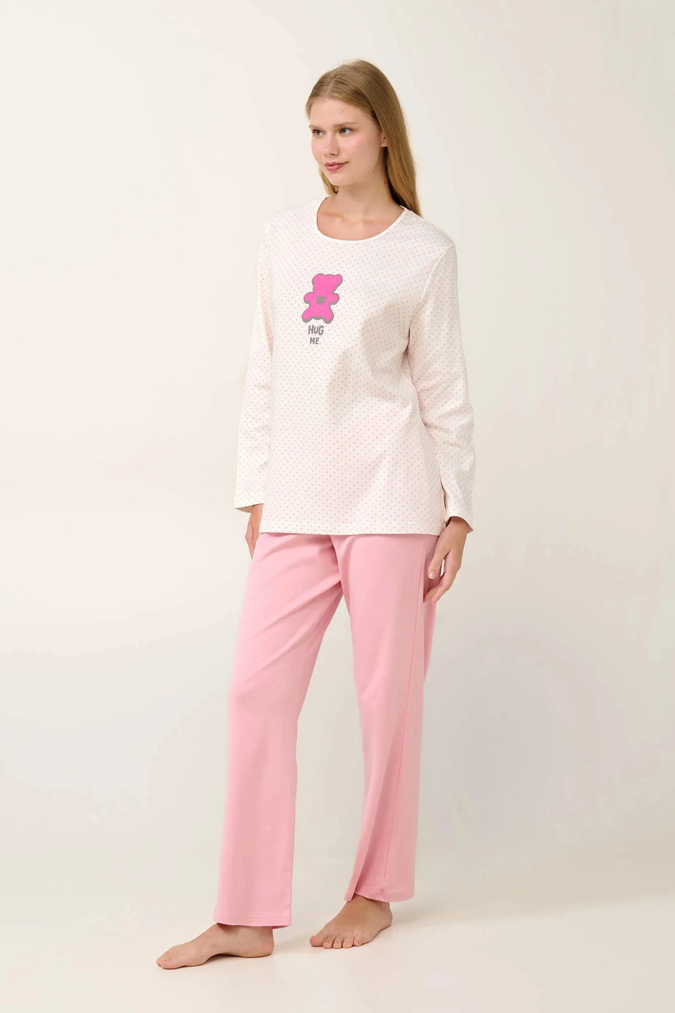 Užijte si příjemné zimní noci s tímto dámským pyžamem ze 100% bavlněného interlocku. Souprava obsahuje hladké kalhoty a puntíkovaný top s roztomilým potiskem a klasickým kulatým výstřihem. Je navrženo ve střihu regular fit, který nabízí pohodlí a lichotivou siluetu. Tato pyžamová souprava, která je ideální pro domácí odpočinek nebo kvalitní spánek, v sobě spojuje styl a pohodlí.