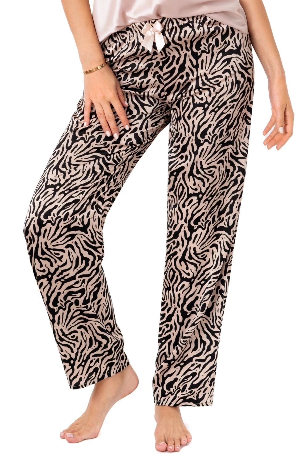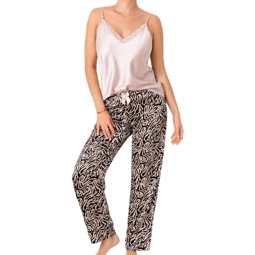 Dámské pyžamo Sheila Donna - z jemného saténu - béžové tílko s úzkými ramínky s regulací - výstřih zdobený krajkou - dlouhé kalhoty se zvířecí motivem - pas zdobený béžovou mašličkou