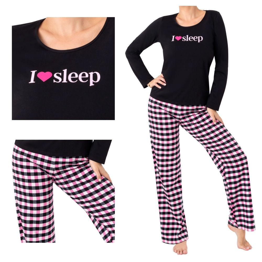 Dámské pyžamo Sleep long black Donna - z vysoce jakostní bavlny - černé tričko s dlouhými rukávy - kulatý výstřih - zdobené potiskem na přední straně - dlouhé vzorované nohavice