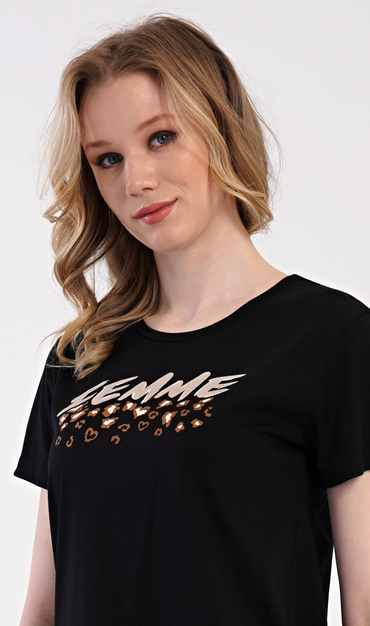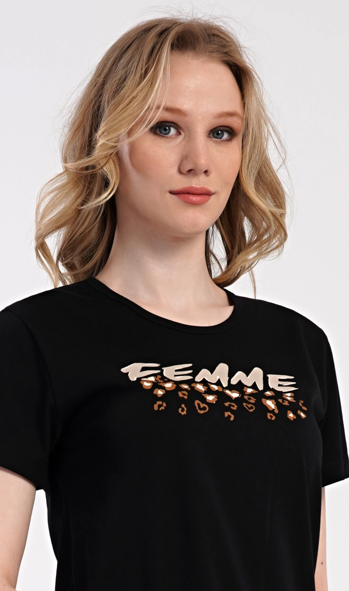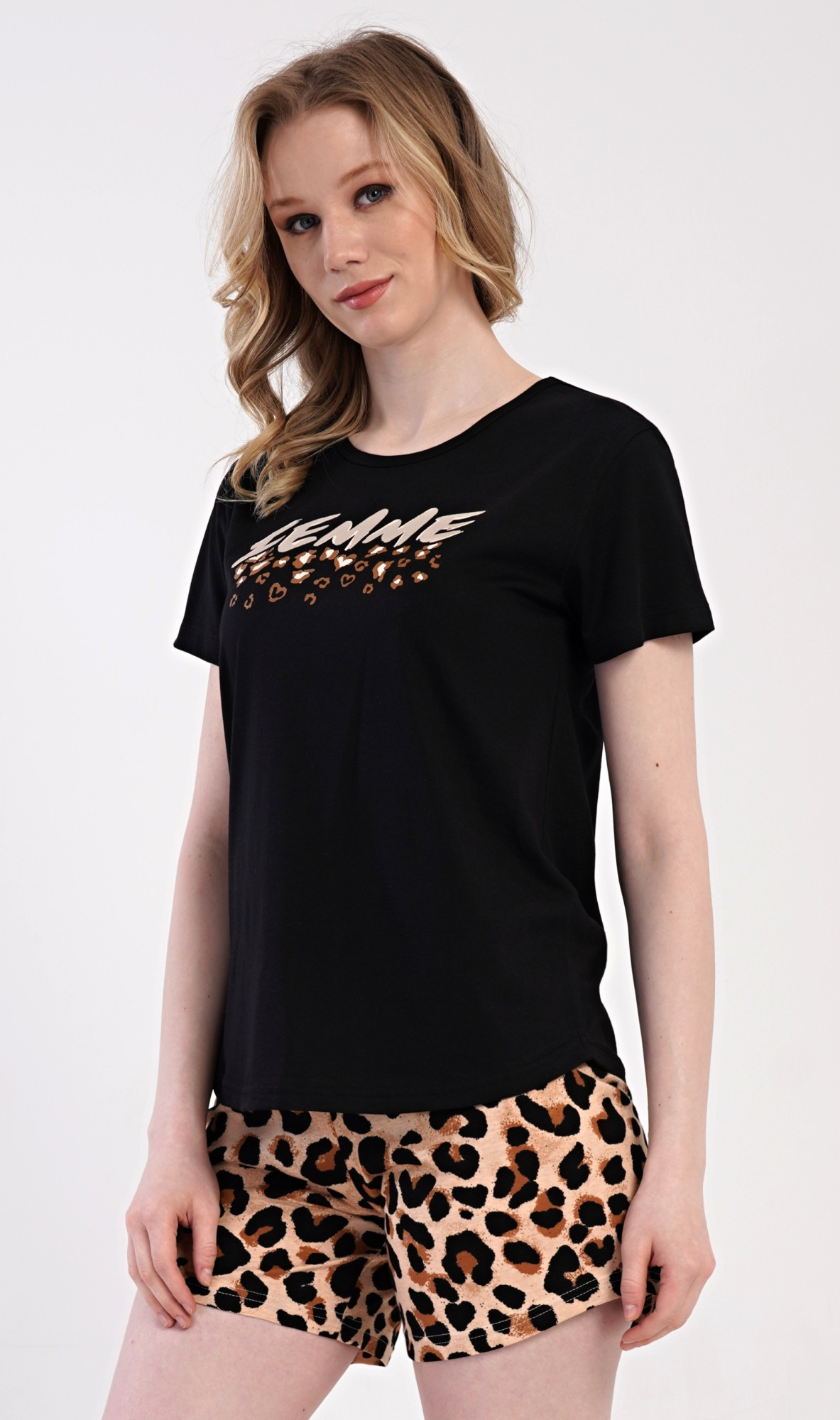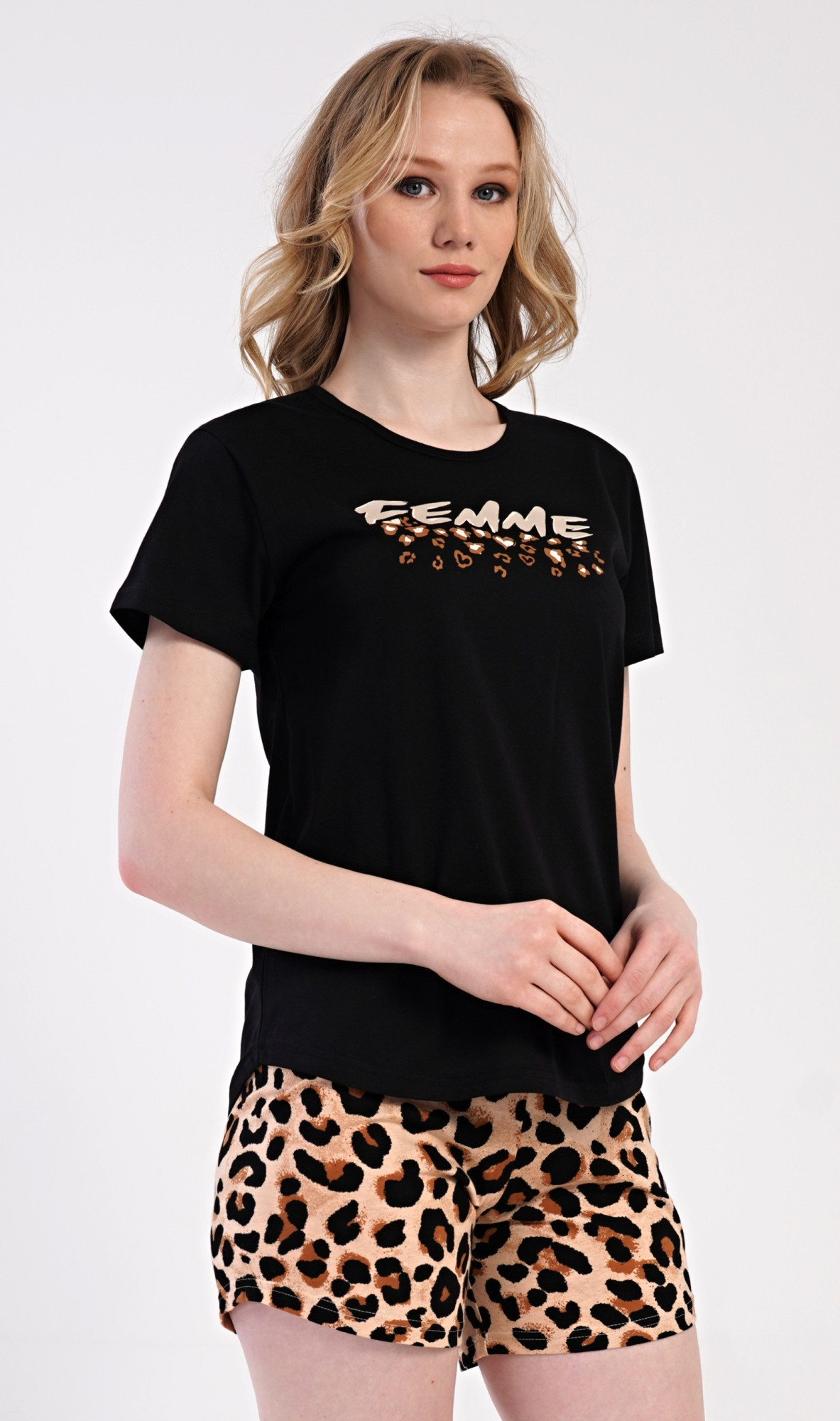 Dámské bavlněné šortkové pyžamo Femme. Dámské pyžamo se skládá z trička s krátkým rukávem a šortkových kalhot. Jednobarevné tričko zdobí nápis FEMME a leopardí vzor. Tento motiv se opakuje i na šortkách, které mají v pase gumu a šňůrku na stáhnutí, jsou bez kapes. Použitý bavlněný materiál je příjemný a poddajný na dotek.