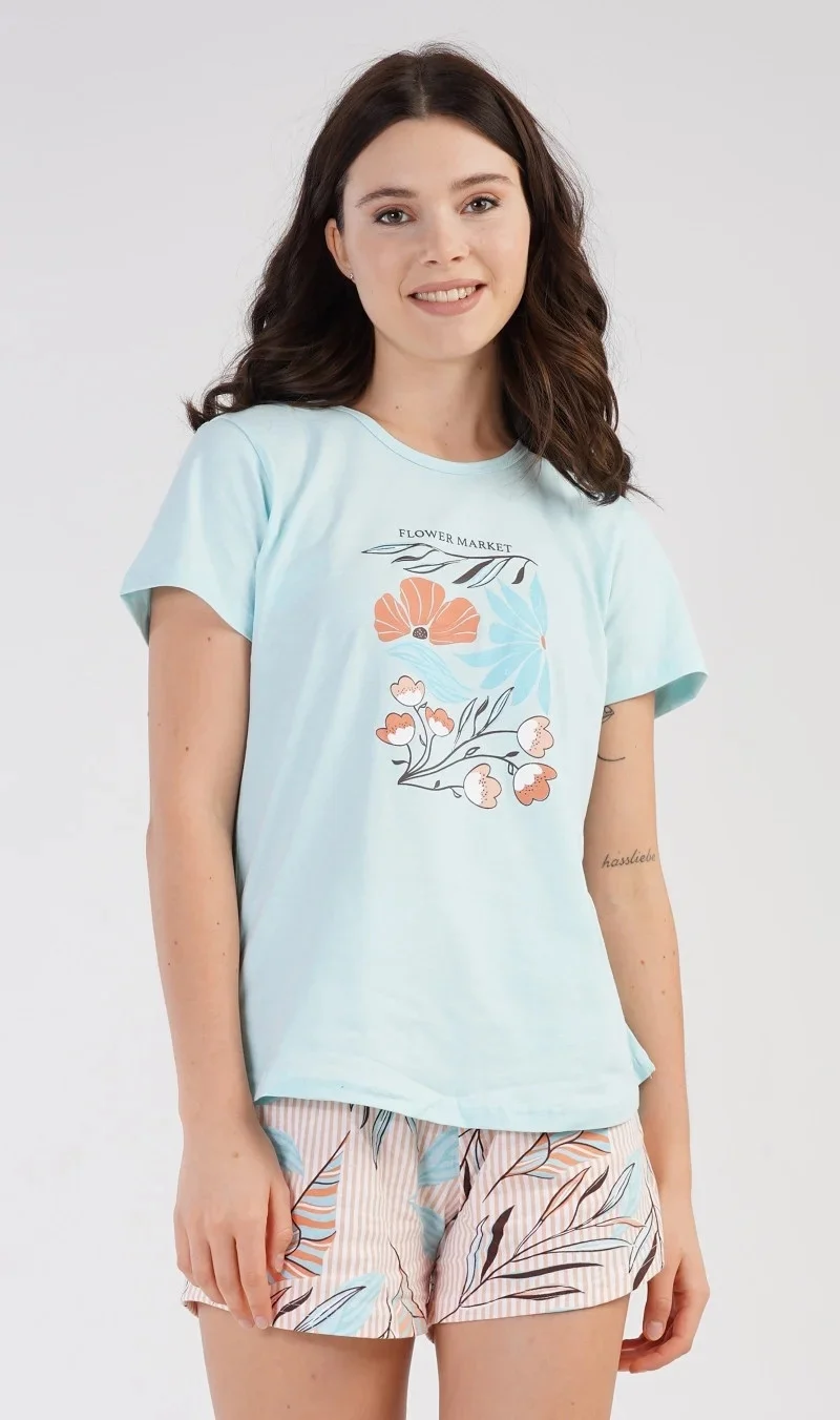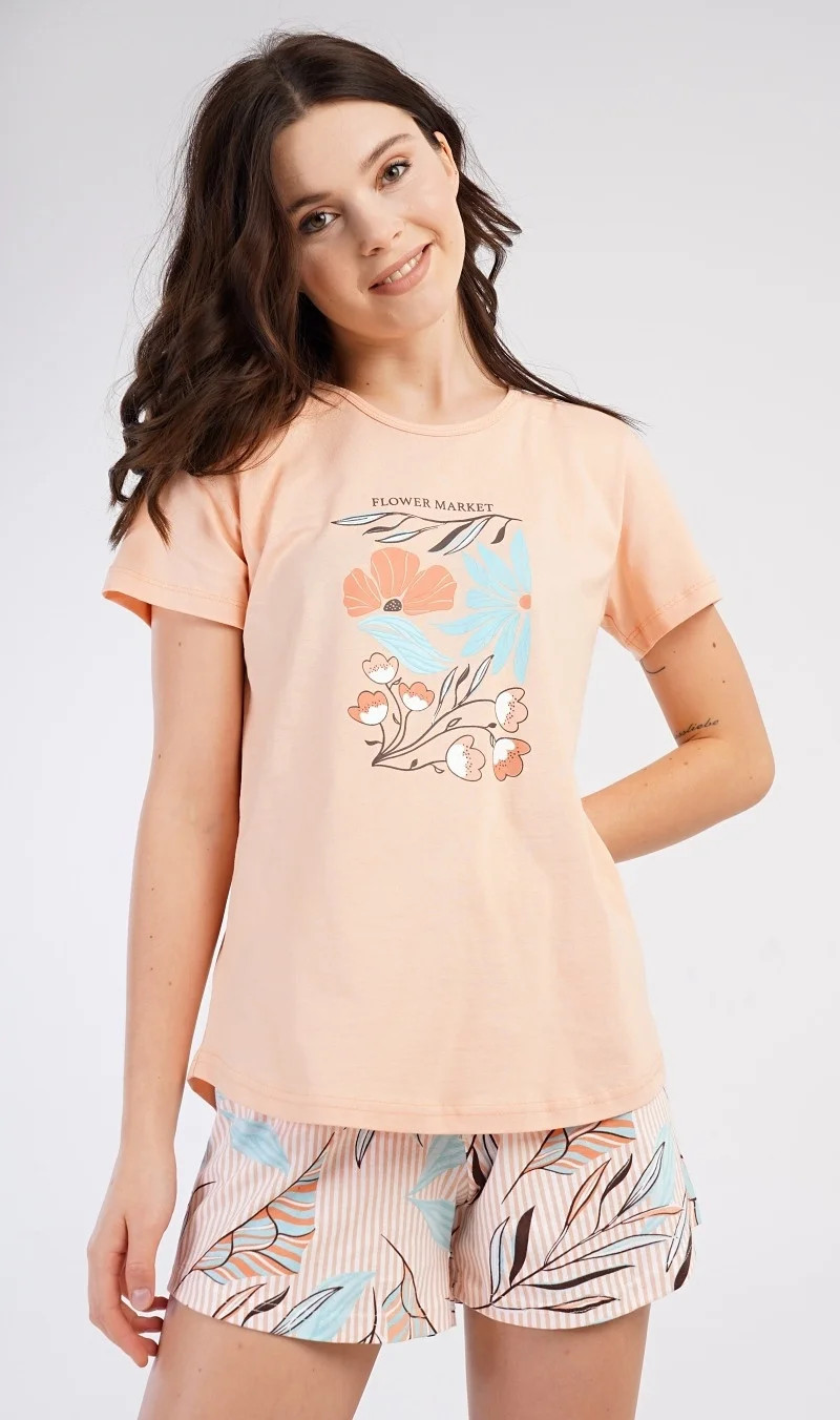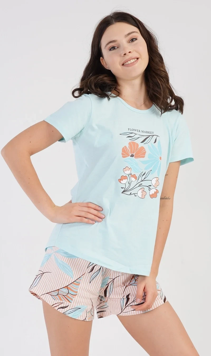 Dámské bavlněné pyžamo šortky Melissa. Dámské pyžamo se skládá z trička s krátkým rukávem a šortkových kalhot. Na jednobarevném tričku je obrázek skládající se z květů, listů a větviček. Stejný motiv se opakuje i na šortkách. Šortky mají v pase gumu a šňůrku na stáhnutí, jsou bez kapes. Použitý bavlněný materiál je příjemný a poddajný na dotek.