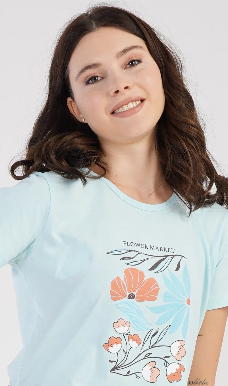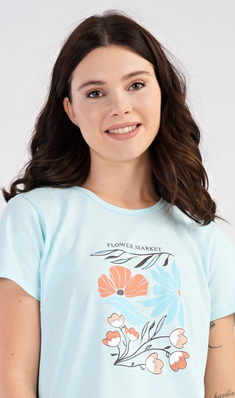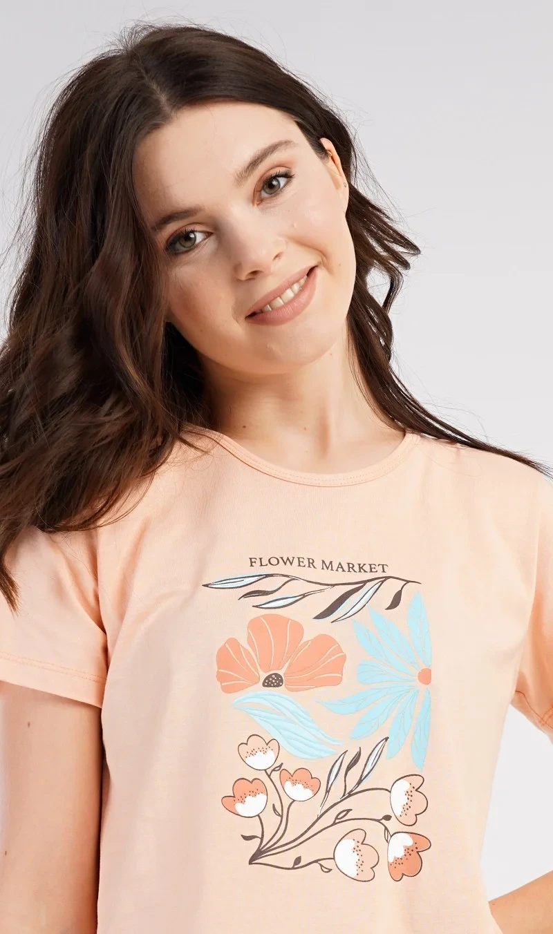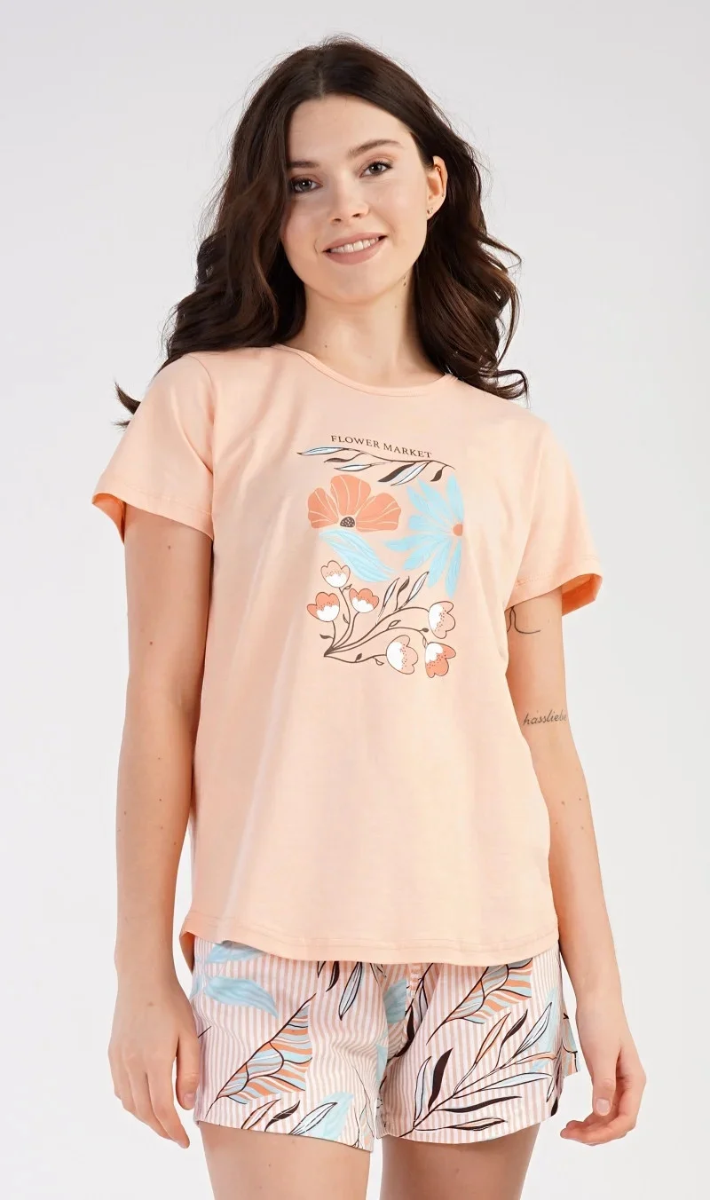 Dámské bavlněné pyžamo šortky Melissa. Dámské pyžamo se skládá z trička s krátkým rukávem a šortkových kalhot. Na jednobarevném tričku je obrázek skládající se z květů, listů a větviček. Stejný motiv se opakuje i na šortkách. Šortky mají v pase gumu a šňůrku na stáhnutí, jsou bez kapes. Použitý bavlněný materiál je příjemný a poddajný na dotek.