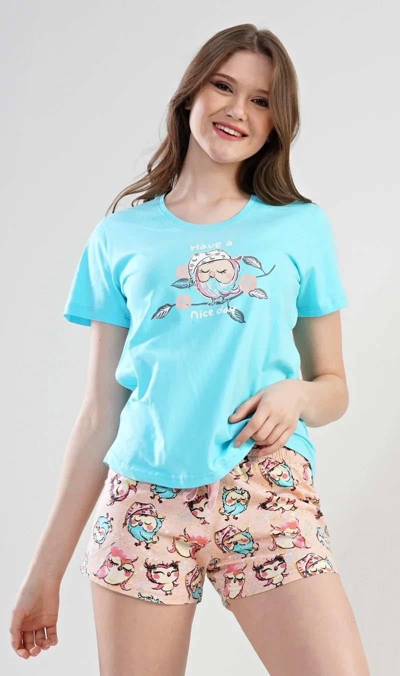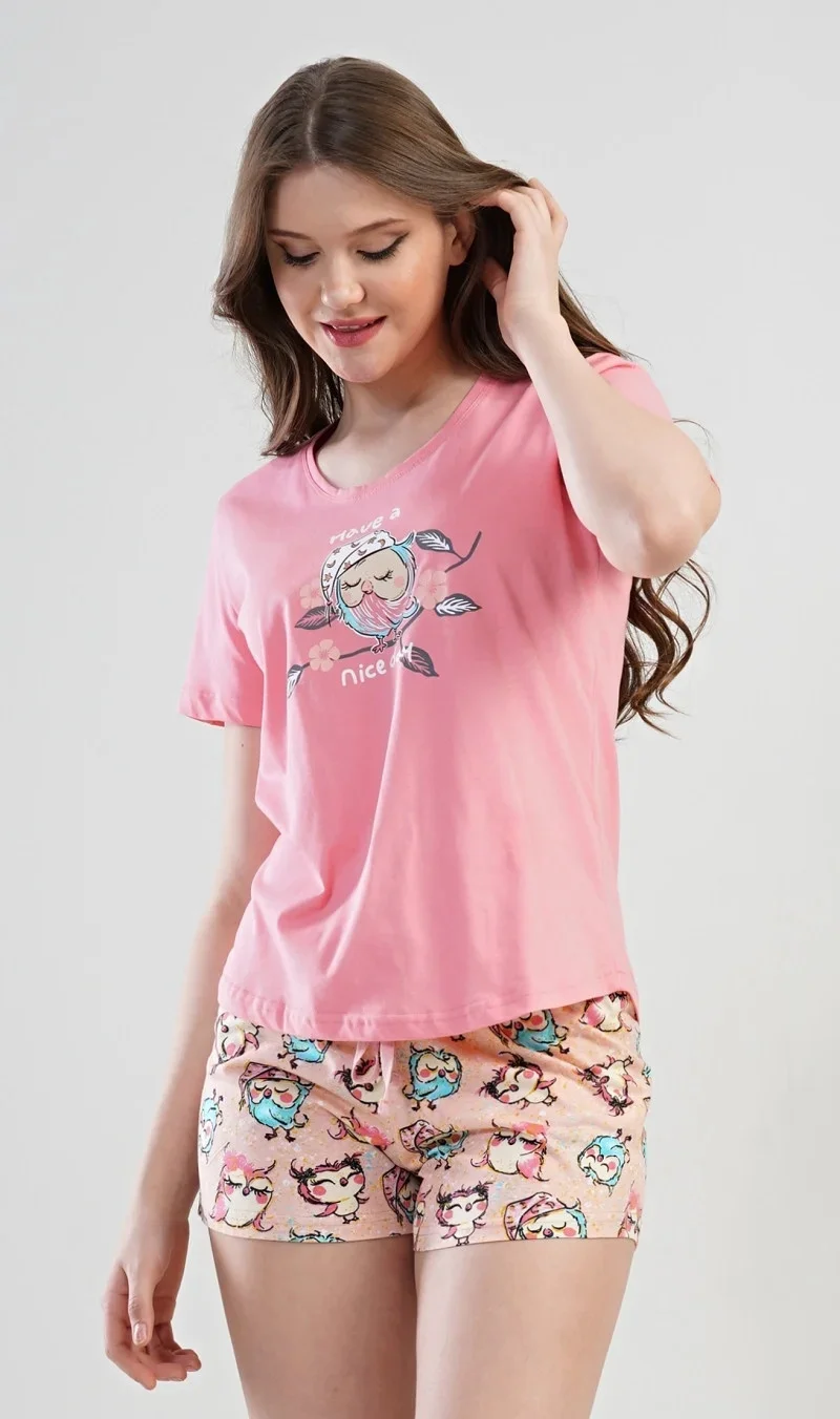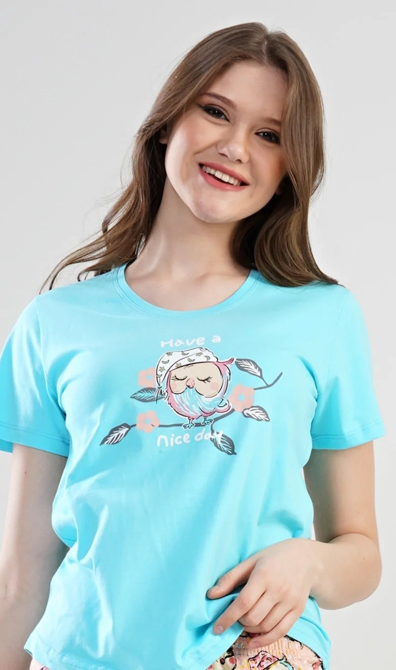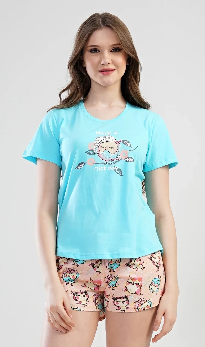 Dámské pyžamo šortky Nice day. Dámské pyžamo šortky se skládá z trička s krátkým rukávem a krátkých šortkových kalhot. Na tričku je obrázek roztomilé spící sovičky na větvi, kolem které je nápis Have a nice day. Motiv soviček se opakuje i na krátkých šortkových kalhotách. Použitý materiál je jemný a poddajný na dotek. Pyžamo je vhodné na denní nošení.