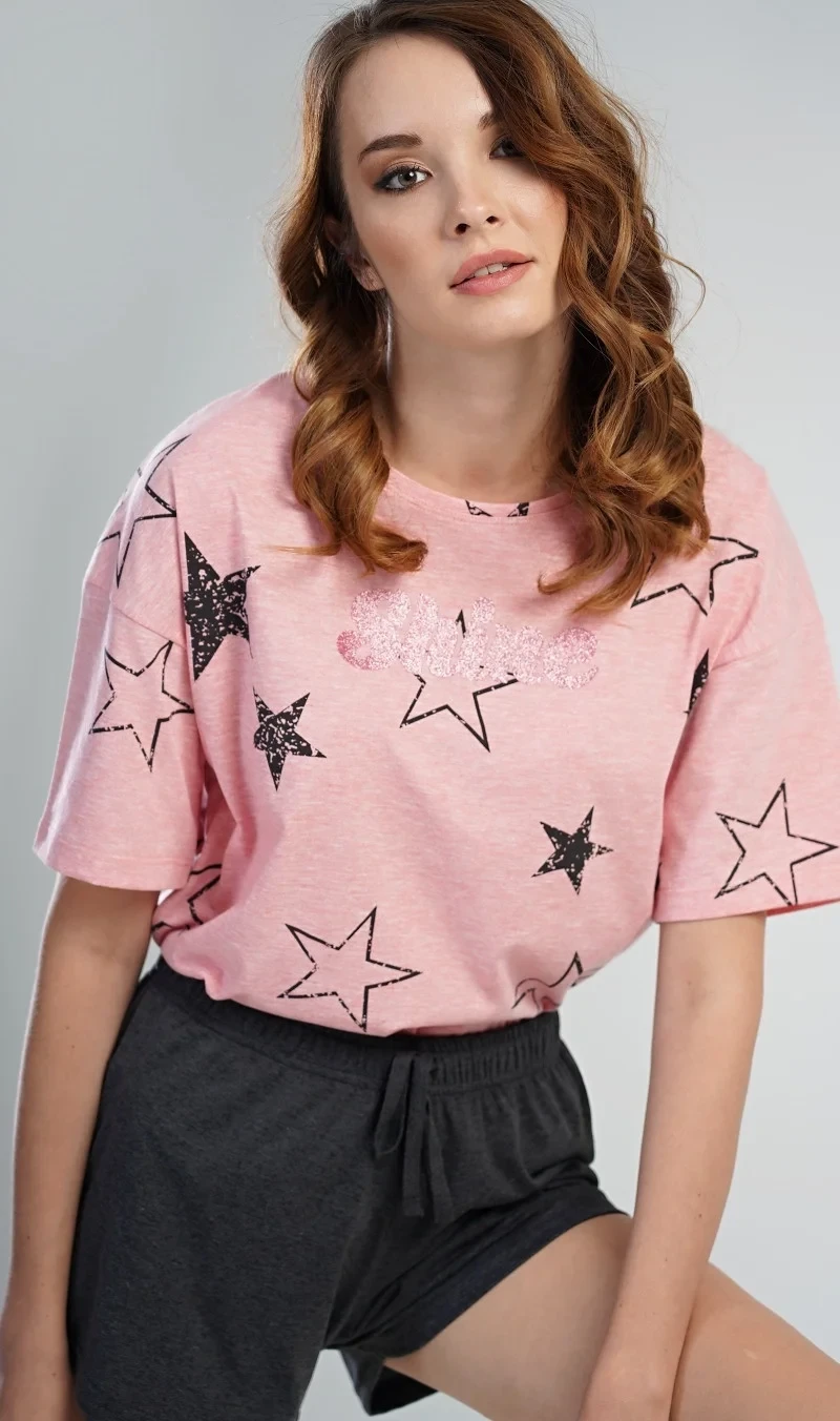 Dámské pyžamo šortky Shine. Dámské pyžamo se skládá z trička s krátkým rukávem a krátkých šortkových kalhot. Na tričku s kulatým výstřihem a efektem spadlých rukávů je lesklý nápis Shine obklopený hvězdami. Výrazné tričko doplňují jednobarevné šortky. Použitý materiál je příjemný a poddajný na dotek. Materiál u šortek i trička má obsah bavlny 70%.