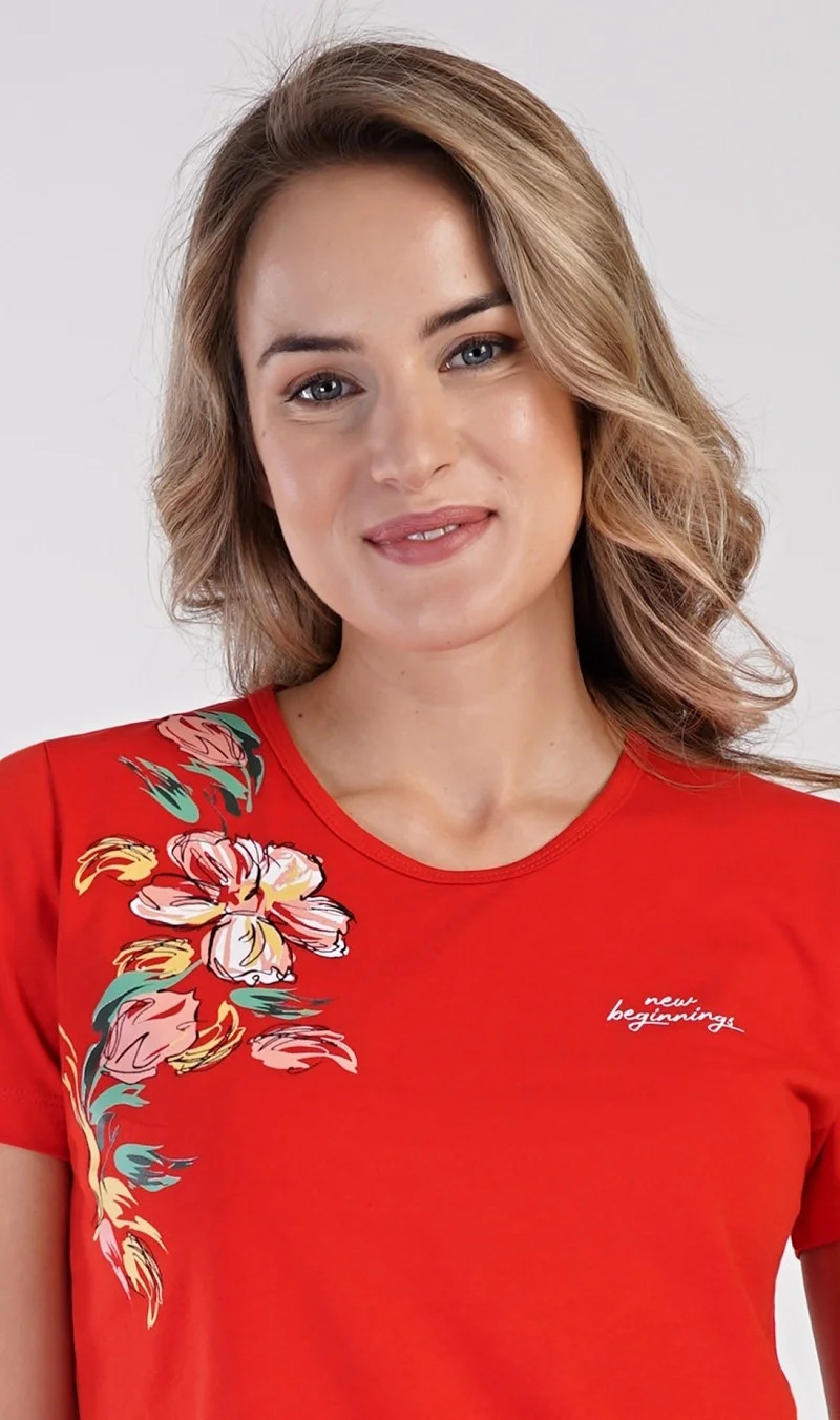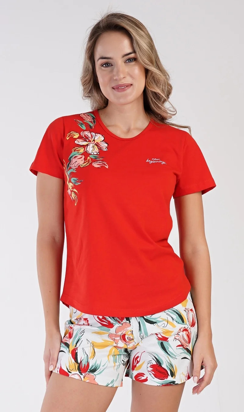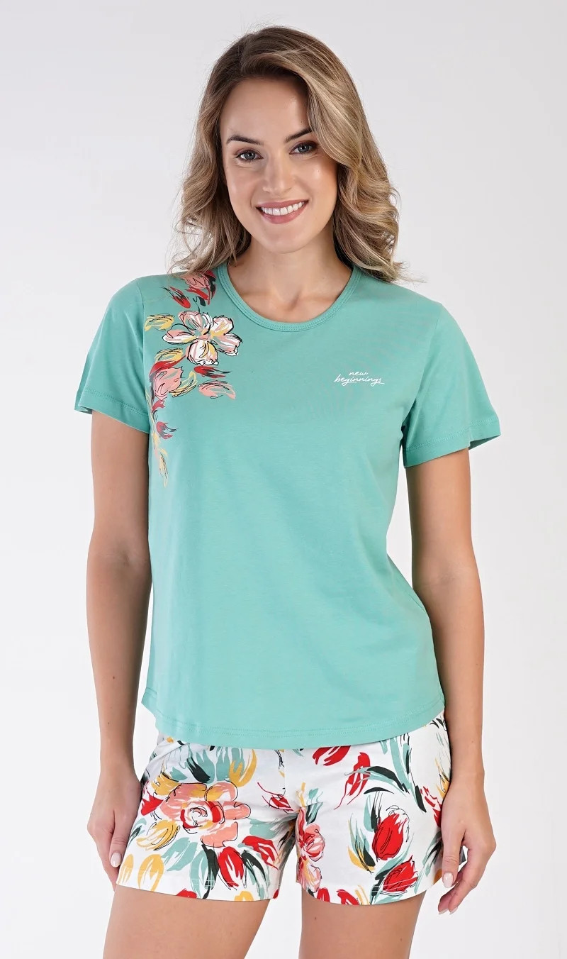Dámské bavlněné pyžamo šortky Sofie. Dámské pyžamo se skládá z trička s krátkým rukávem a šortkových kalhot. Na jednobarevném tričku je obrázek pestrých květů a nápis 'New beginnings'. Motiv květů se opakuje i na barevných šortkách. Šortky mají v pase gumu a šňůrku na stáhnutí, jsou bez kapes. Použitý bavlněný materiál je příjemný a poddajný na dotek.
