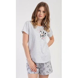 Dámské šortkové pyžamo Zebra. Dámské pyžamo se skládá z trička s krátkým rukávem a šortkových kalhot. Na jednobarevném tričku je obrázek veselé zebry a nápis 'Enjoy every day'. Potisk malých zeber se opakuje i na šortkách, které mají v pase gumu a šňůrku na stáhnutí, jsou bez kapes. Použitý materiál je příjemný a poddajný na dotek. Šortky mají podíl bavlny 100%, tričko v lososové barvě 100% a v šedé 70% bavlny.