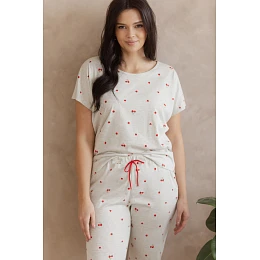 Vrchní část soupravy tvoří tričko s krátkým rukávem a kulatým výstřihem, zdobené půvabným potiskem ovoce v podobě jablek, který celku dodává lehký a dívčí charakter. Soupravu doplňují pohodlné kalhoty v délce 7/8, které zajišťují volnost pohybu a jsou ideální zejména v teplejších dnech.