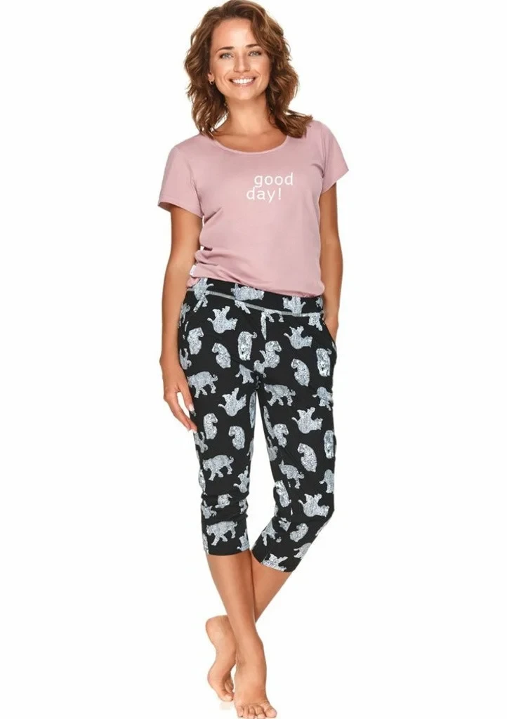 Dámské pyžamo značky Taro. Pyžamo má krátký rukávek a kalhoty v délce pod kolena. Top starorůžové barvy má kulatý výstřih. Kalhoty jsou ozdobené zajímavým potiskem.