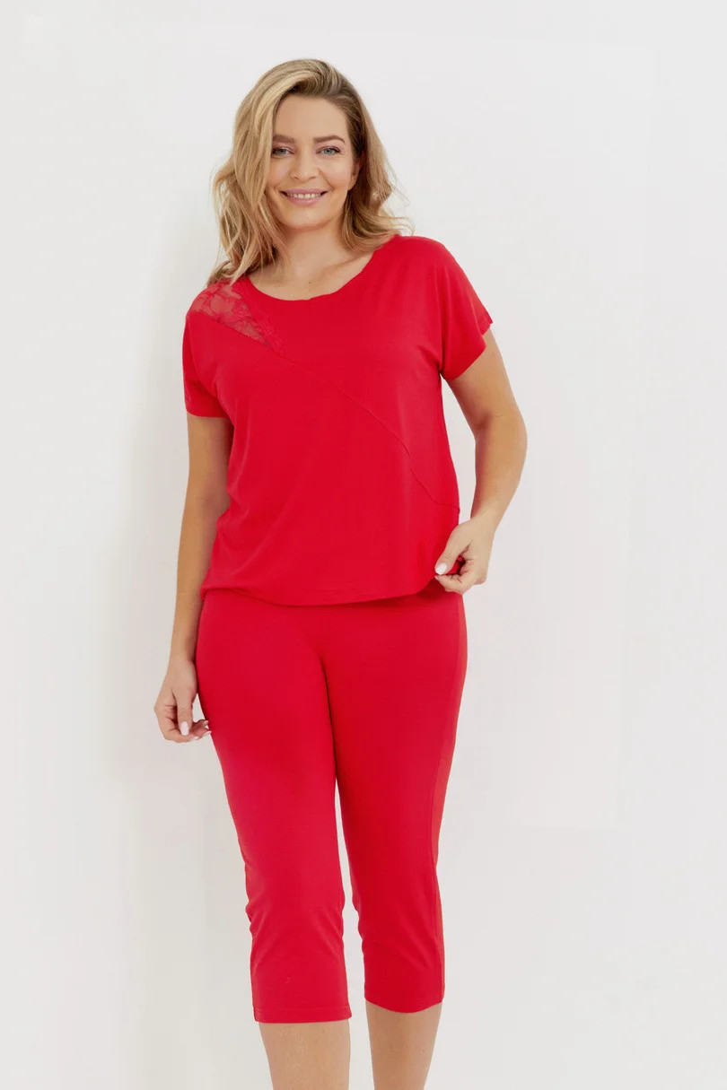 Dámské pyžamo s krátkými rukávy z vysoce kvalitní viskózy s kontrastní krajkou našitou na ramenou, doplněné síťovanými kalhotami.