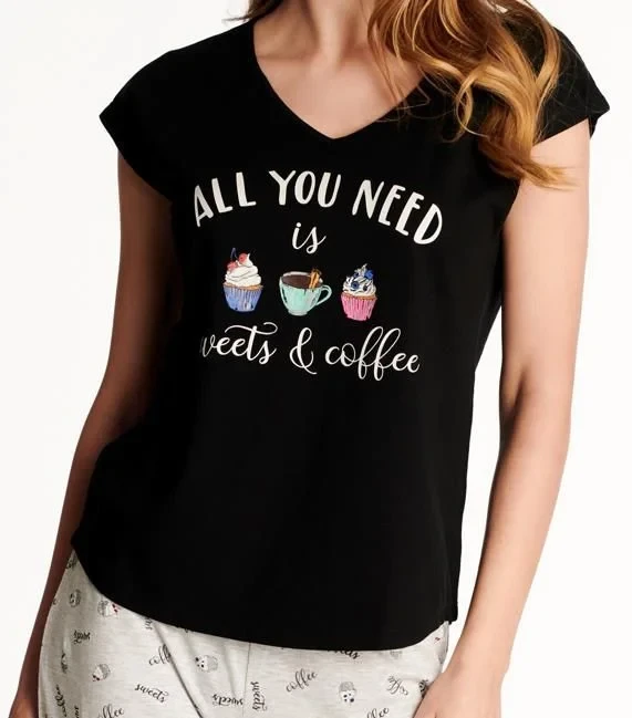 Ach, ty sladké doteky! Westley je nejnovější dámské pyžamo značky Henderson s motivem sladkých srdíček, a to doslova, na horním dílu s nápisem "All You need is sweets & coffee" a sušenkami. Tmavě černý podklad skvěle doplňuje motiv sladkých srdíček. Součástí soupravy jsou také velmi pohodlné vzorované kalhoty v délce ke kolenům s plochým, širokým, potištěným elastickým pasem. Složení: Tričko: 95 % bavlna, 5 % elastan. Kalhoty: 90 % bavlna, 5 % viskóza, 5 % elastan.