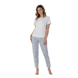 Dámské pyžamo s krátkým rukávem, vyrobené z jemné bavlny, přední díl s potiskem, vzorované kalhoty v délce 7/8 s rovnými nohavicemi.