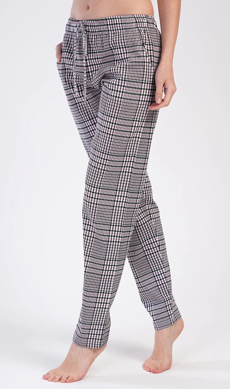 Dámské bavlněné pyžamové kalhoty Carmen. Dámské pyžamové dlouhé kalhoty s károvaným vzorem mají v pase gumu a šňůrku ke stažení. Kalhoty mají praktické kapsy a jsou vhodné i na denní nošení. Použitý bavlněný materiál je příjemný a poddajný na dotek.
