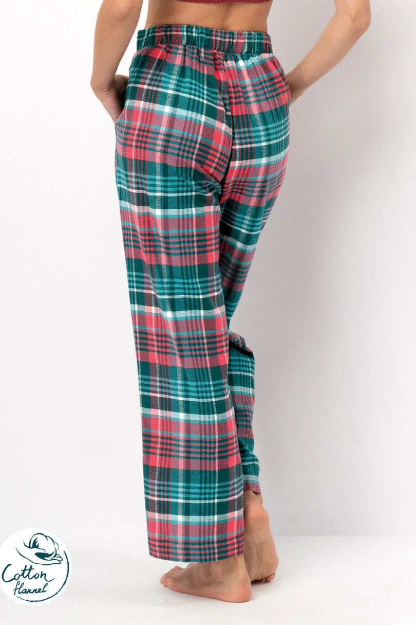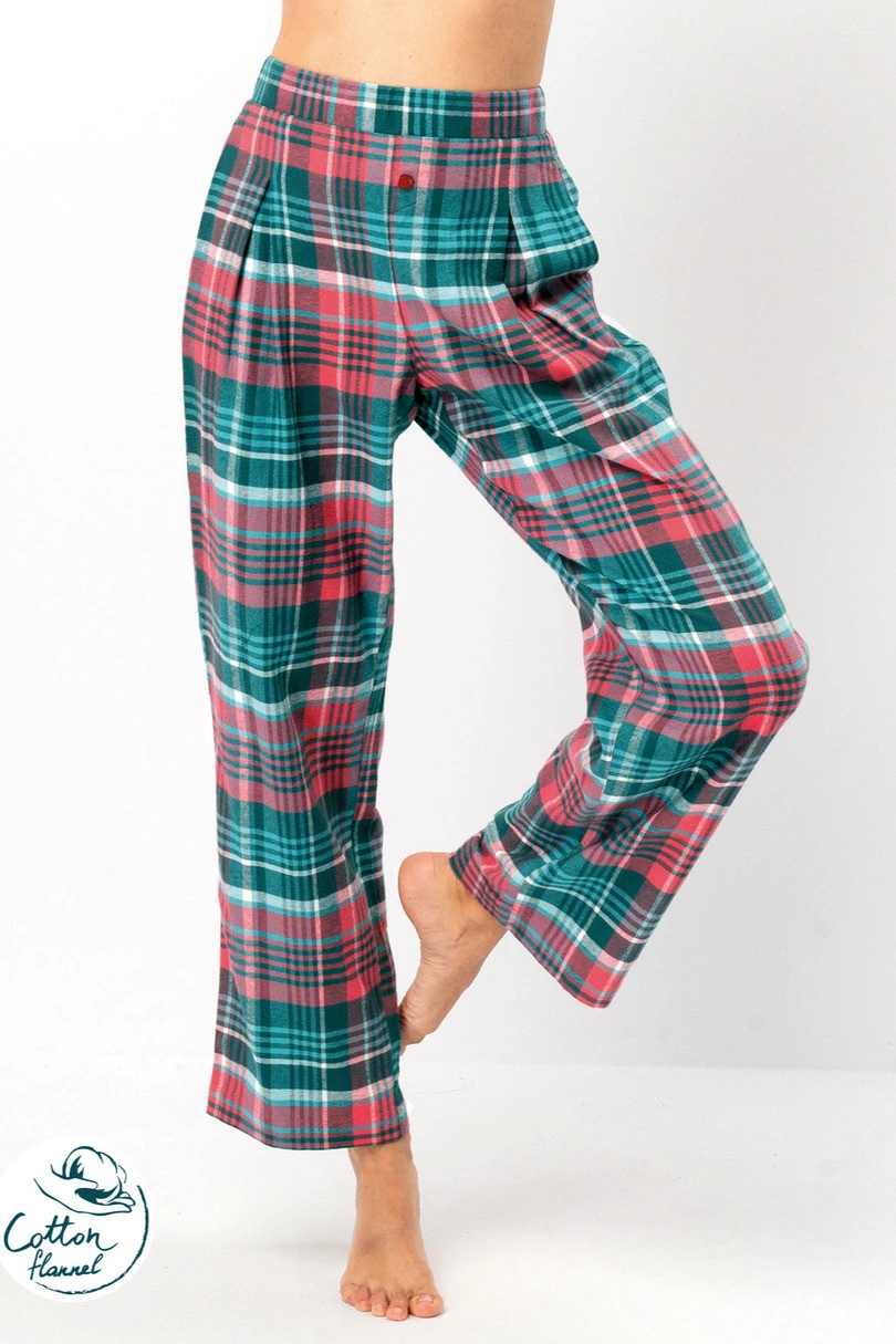 Te damskie spodnie flanelowe to doskonały wybór na chłodniejsze dni i wieczory. Uszyte z wysokiej jakości bawełny flanelowej, są wyjątkowo miękkie i przyjemne w dotyku, a jednocześnie zapewniają świetną izolację cieplną. Klasyczny krój z prostą nogawką gwarantuje swobodę ruchów, a wygodny pas z zapięciem na guziki zapewnia stabilne dopasowanie. Wzór w zielono-czerwoną kratę nadaje im świątecznego, przytulnego charakteru, dzięki czemu doskonale sprawdzą się zarówno jako element piżamy, jak i komfortowy strój domowy.