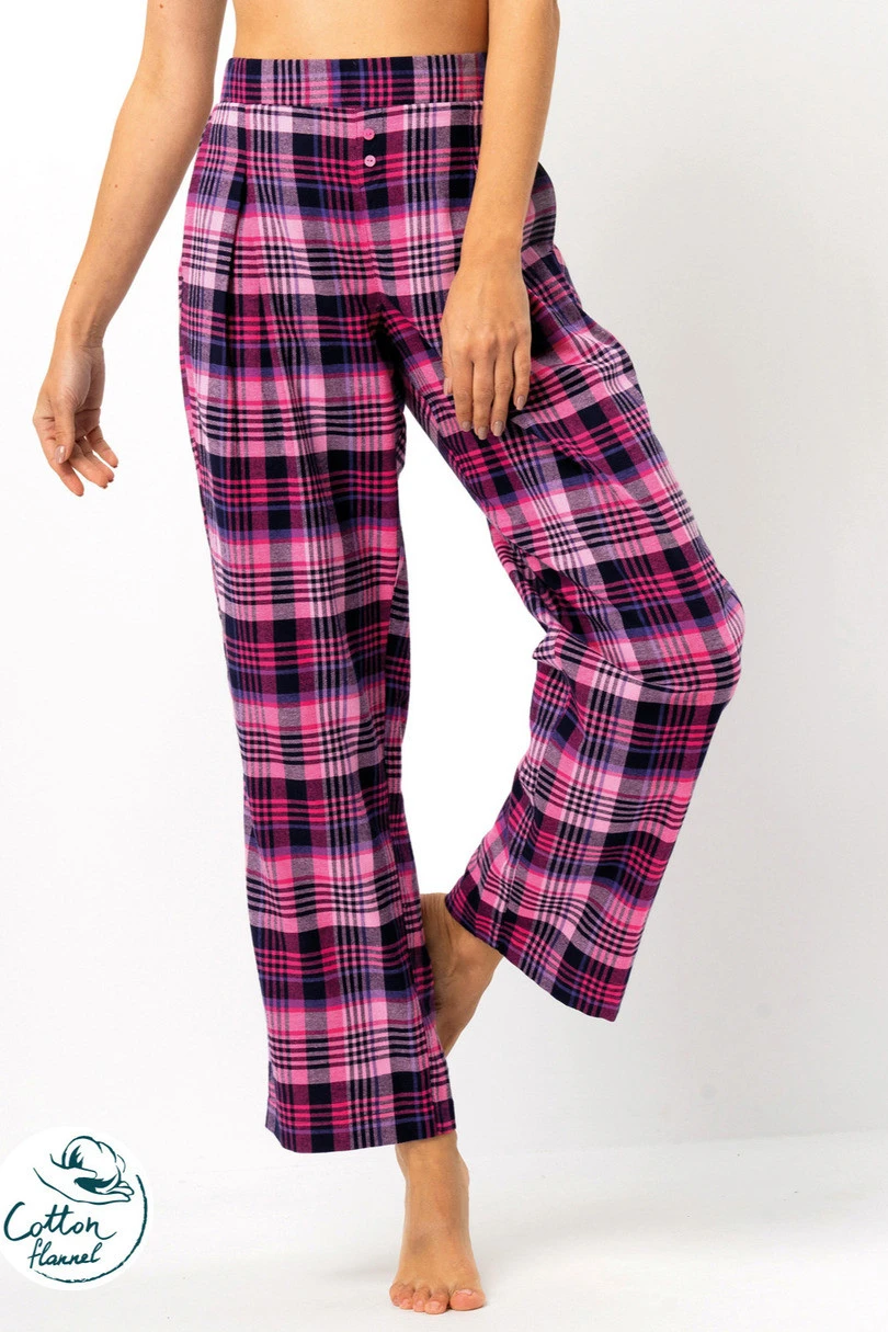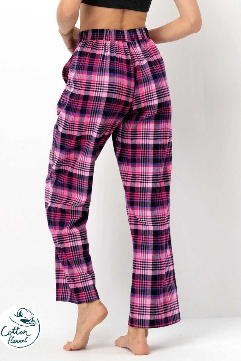 Te damskie spodnie flanelowe to idealny wybór dla kobiet, które cenią sobie komfort, styl i praktyczność w domowym zaciszu. Wykonane z wysokiej jakości bawełny flanelowej, są wyjątkowo miękkie w dotyku i doskonale utrzymują ciepło. Klasyczny, prosty krój zapewnia swobodę ruchów, a elegancki wzór w różowo-czarną kratę dodaje im modnego charakteru. Spodnie posiadają wygodny pas z zapięciem na guziki, co gwarantuje stabilne dopasowanie. Świetnie sprawdzą się jako element piżamy lub domowego stroju na zimowe wieczory.