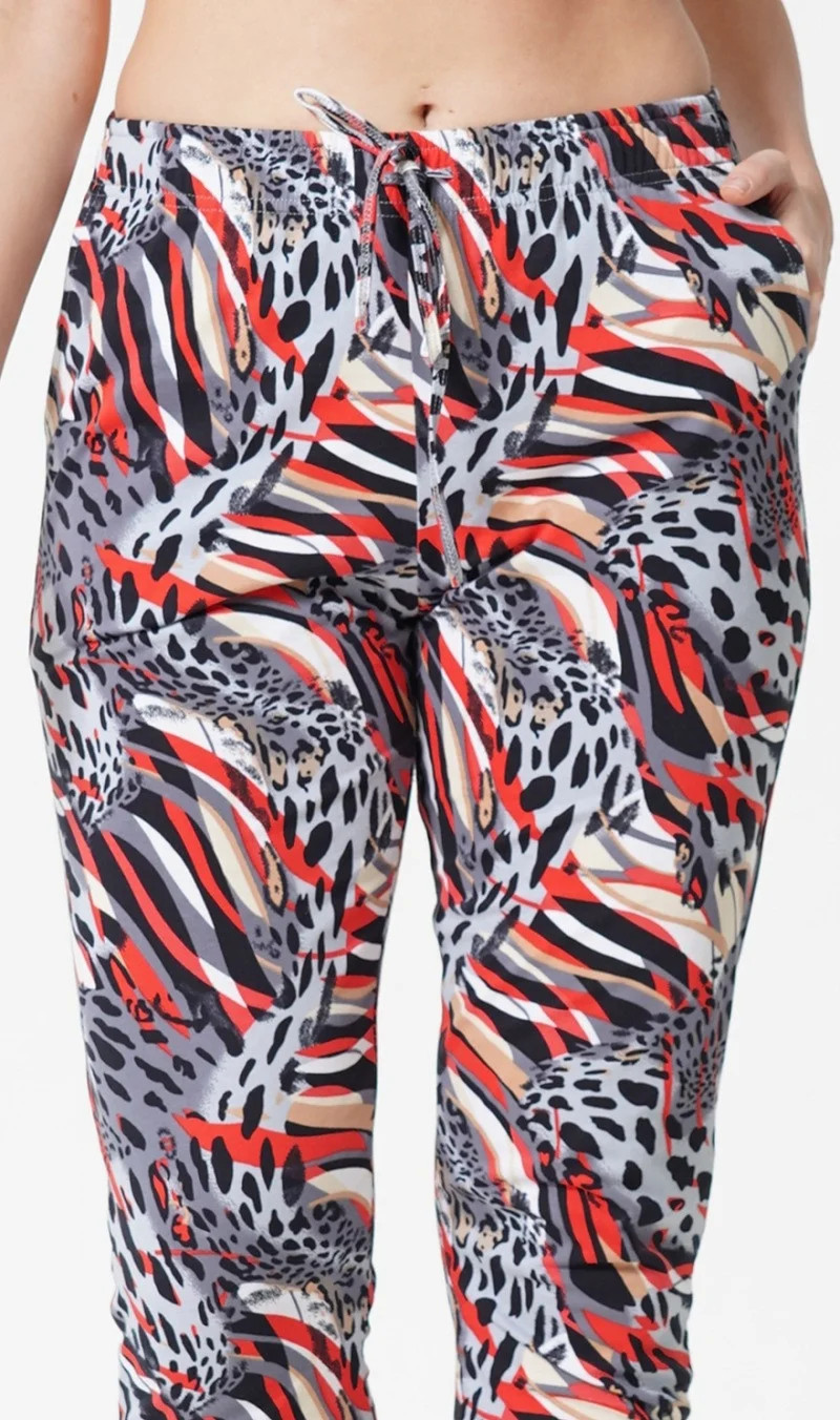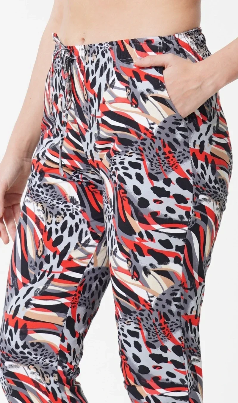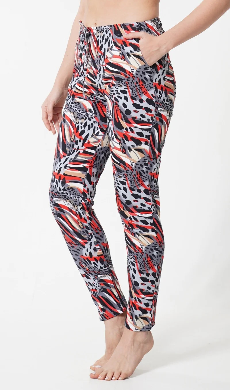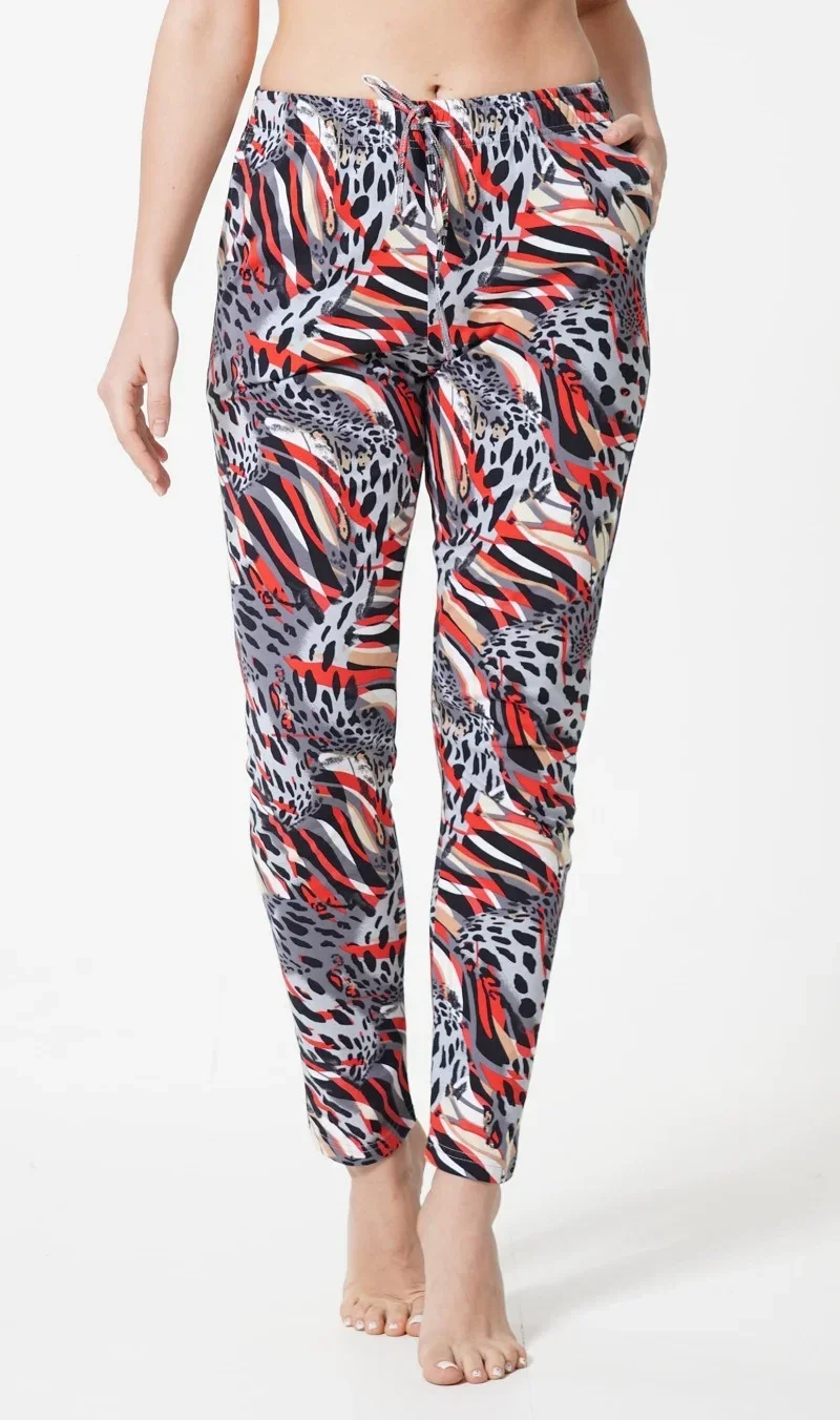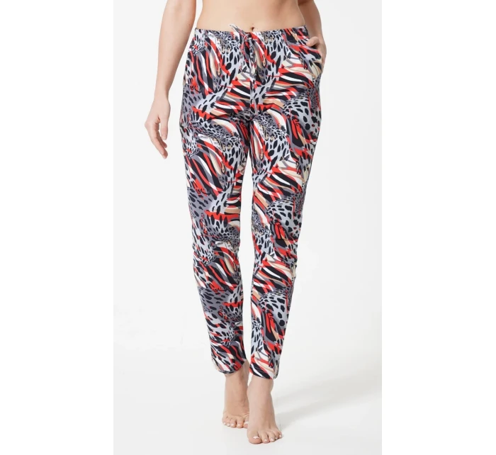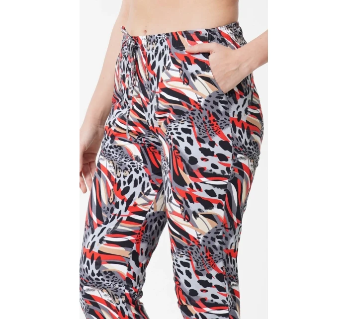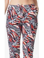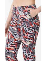 Dámské pyžamové kalhoty Safari. Dámské pyžamové dlouhé kalhoty se safari vzorem mají praktické kapsy a šňůrku ke stažení v pase. Použitý materiál je jemný a poddajný na dotek. Kalhoty jsou vhodné na denní nošení.
