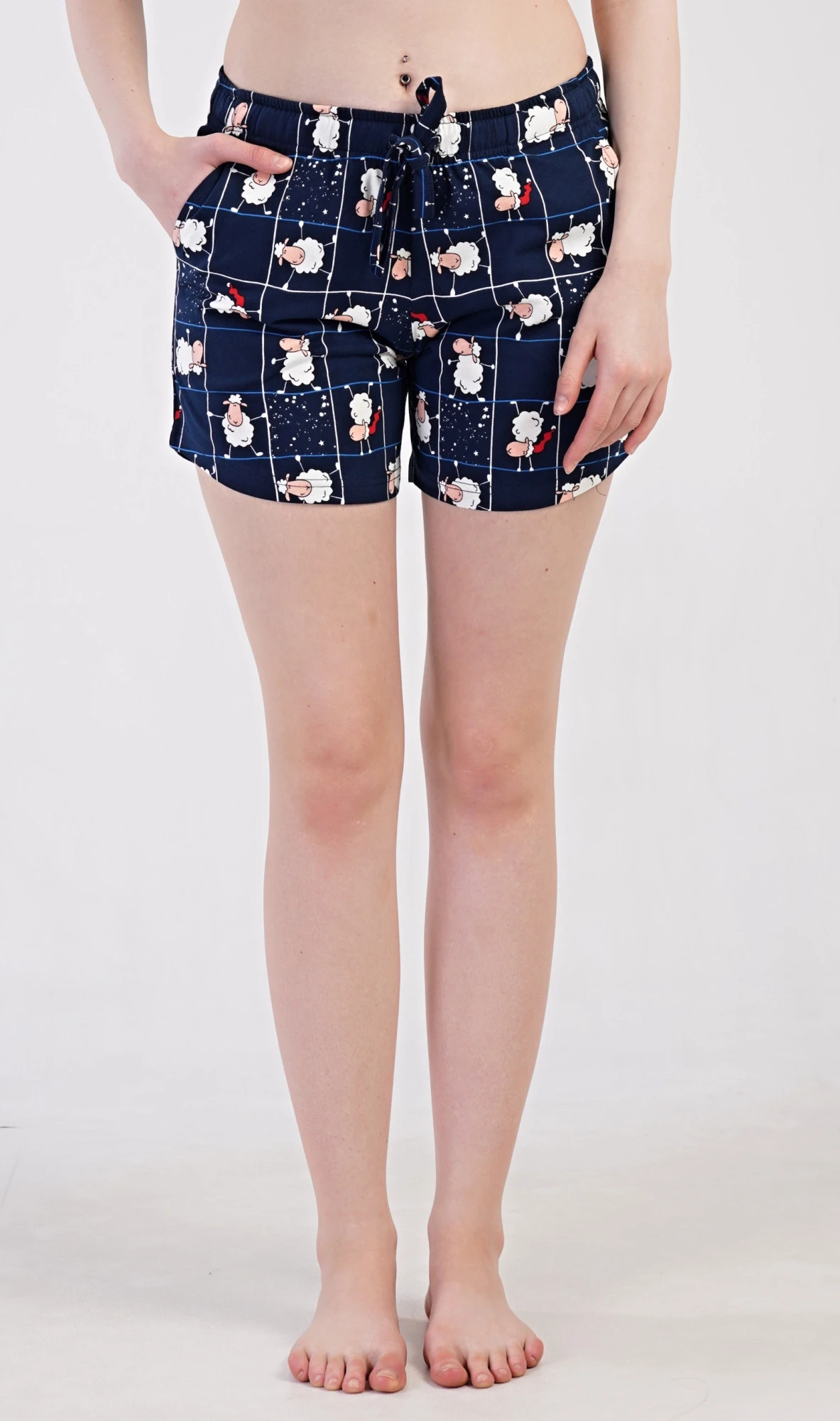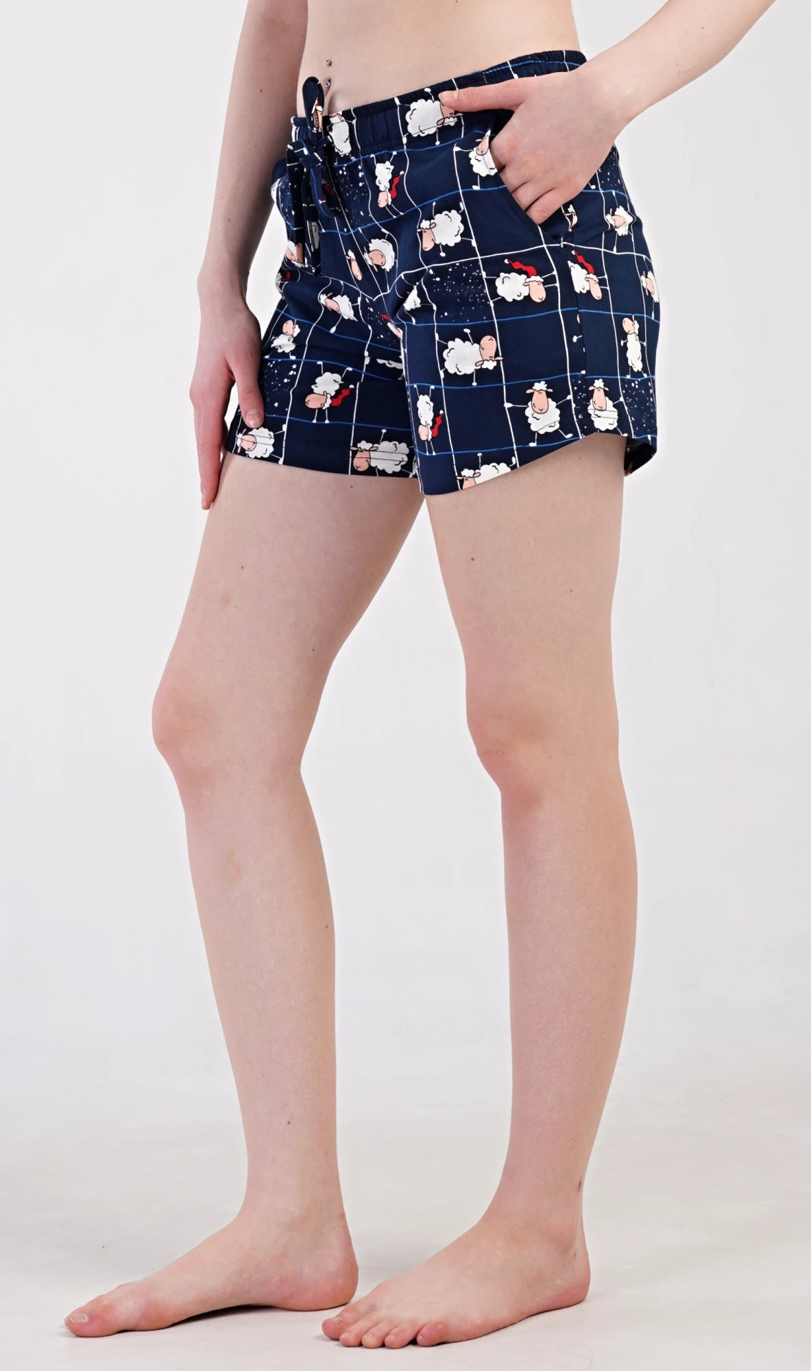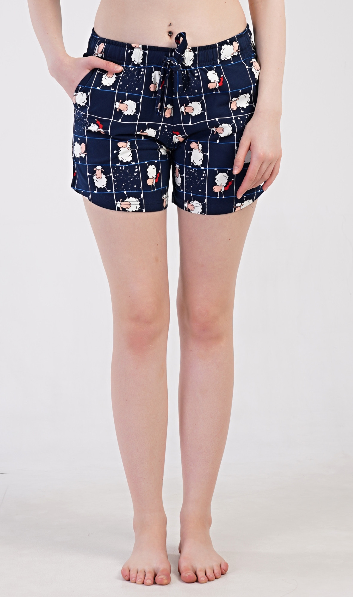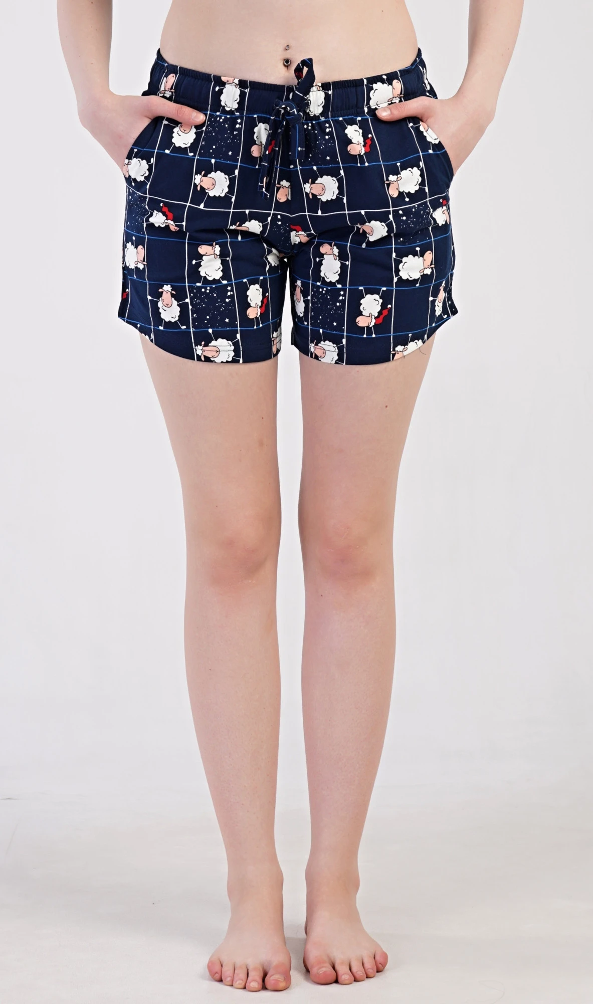 Dámské bavlněné pyžamové šortky Ovečky. Pyžamové krátké kalhoty jsou zdobeny potiskem oveček. Mají v pase gumu, šňůrku na stažení a praktické kapsy. Použitý bavlněný materiál je příjemný a poddajný na dotek.
