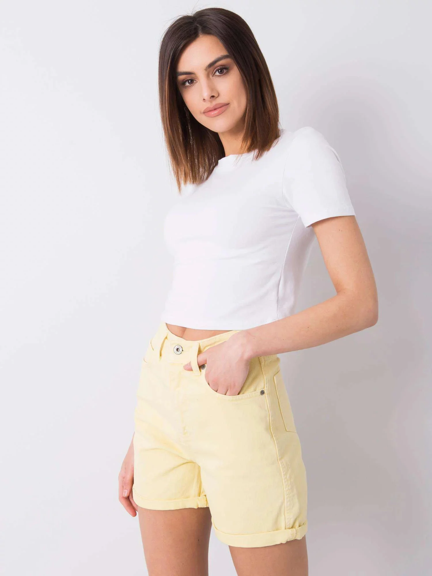 Produkt Dámské riflové kraťasy 7706 - RUE PARIS prodáváme v těchto velikostech: 42/XLa barvách žlutá2016102862567