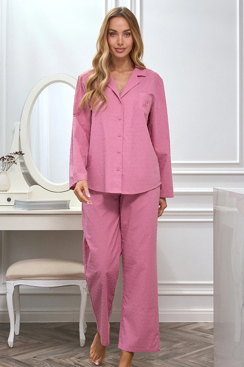 Dámské pyžamo 2610 se zapínáním na zip je ideální volbou pro ženy, které ocení pohodlí a klasický styl. Je vyrobeno ze 100% přírodní bavlny a poskytuje maximální prodyšnost a pohodlí, zejména během teplejších nocí. Model je k dispozici v nadčasovém pruhovaném vzoru nebo s jemnými vyšívanými puntíky, které celku dodávají jemný půvab. Límeček košile se zapínáním na knoflíky dodává pyžamu elegantní nádech, zatímco náprsní kapsa s vyšitým logem L&L podtrhuje jeho vysokou kvalitu. Dlouhé kalhoty s pohodlnými kapsami a regulací v pase na šňůrku zaručují dokonalé přizpůsobení a volnost pohybu. Jedná se o ideální pyžamo pro spánek i pohodlný odpočinek doma.