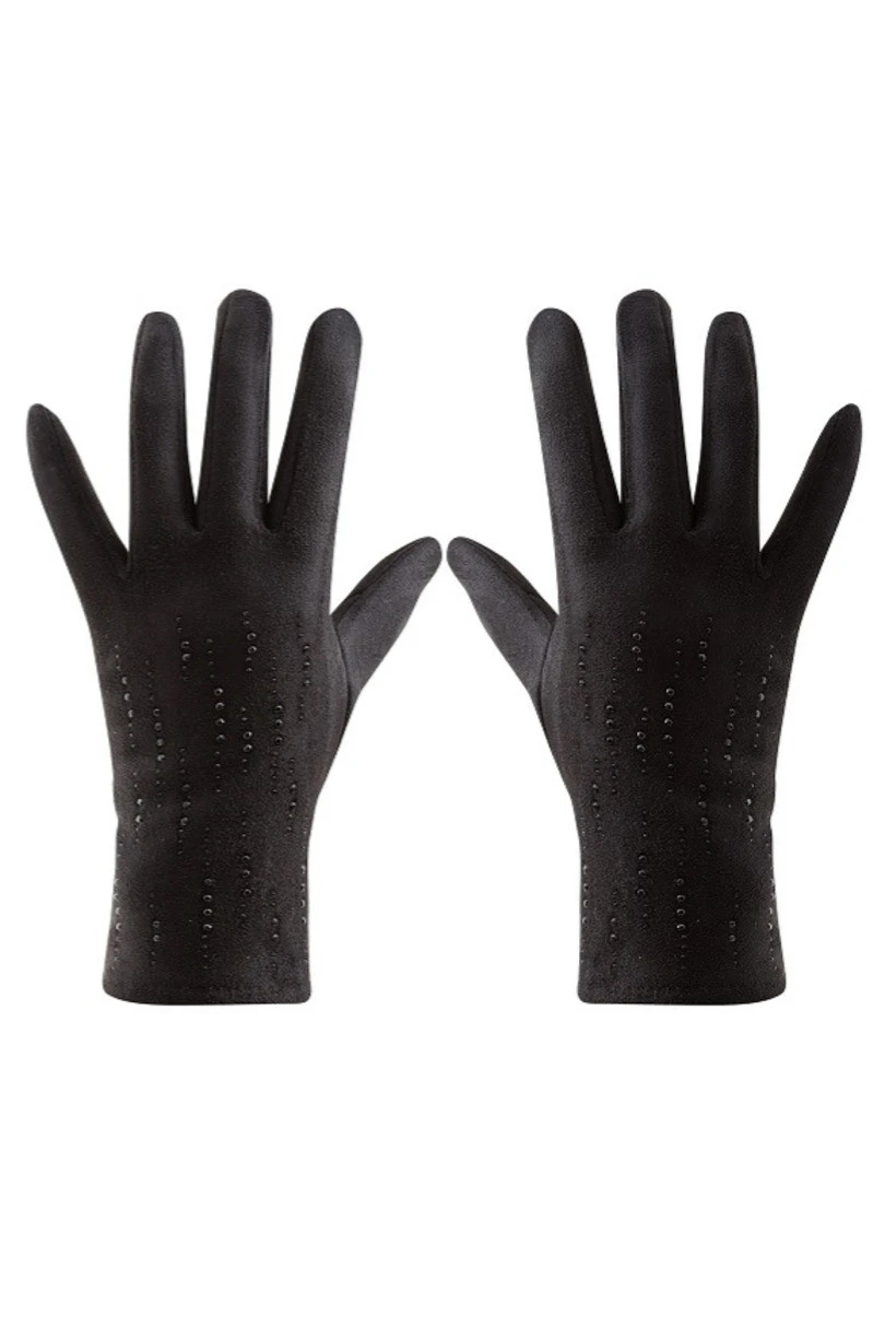 Zachwyć klasą i subtelnym blaskiem w chłodne dni! Te eleganckie, szyte rękawiczki damskie zostały ozdobione czarnymi cyrkoniami, które dodają im wyjątkowego szyku i kobiecego uroku. To propozycja dla kobiet ceniących elegancję, wysoką jakość oraz nowoczesne rozwiązania. Wykonane z niezwykle przyjemnego w dotyku materiału, rękawiczki gwarantują pełen komfort noszenia. Wnętrze ocieplone miękkim welurem, otula dłonie ciepłem i delikatnością. Dzięki wbudowanej funkcji dotykowej możesz swobodnie obsługiwać smartfon, bez konieczności zdejmowania rękawiczek — niezależnie od pogody. Stylowy detal w postaci czarnych cyrkonii czyni z nich nie tylko praktyczny, ale również luksusowy dodatek do zimowych stylizacji.