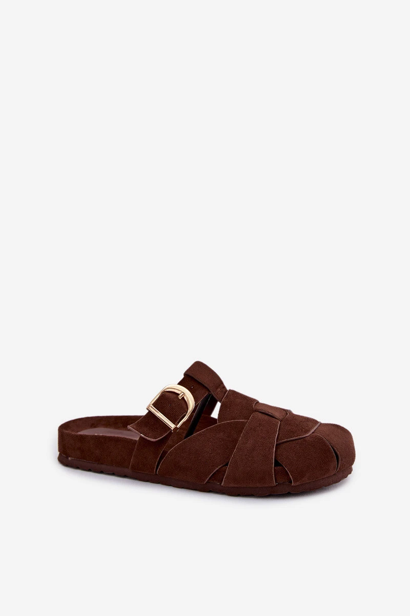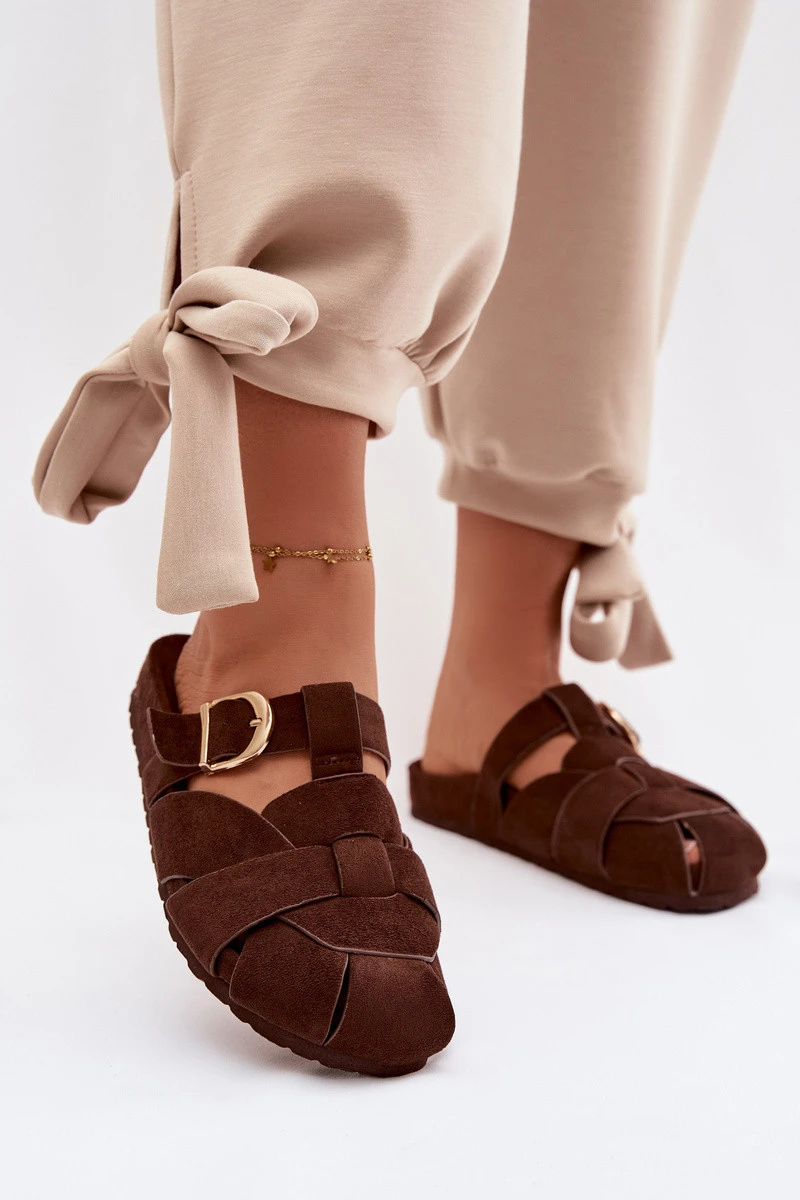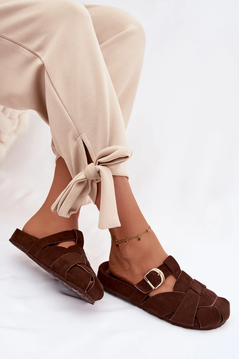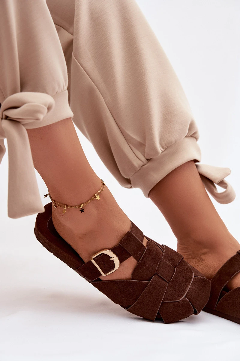Dámské pantofle z eko semiše typu mule jsou spojení pohodlí a módního vzhledu. Pásky se zlatou sponou tvoří efektní detail, který dodává celku eleganci a moderní charakter. Profilovaná vložka zajišťuje pohodlí při nošení a lepší přizpůsobení noze. Tento model je skvělý pro každodenní stylizace. Při výběru velikosti se řiďte tabulkou velikostí.